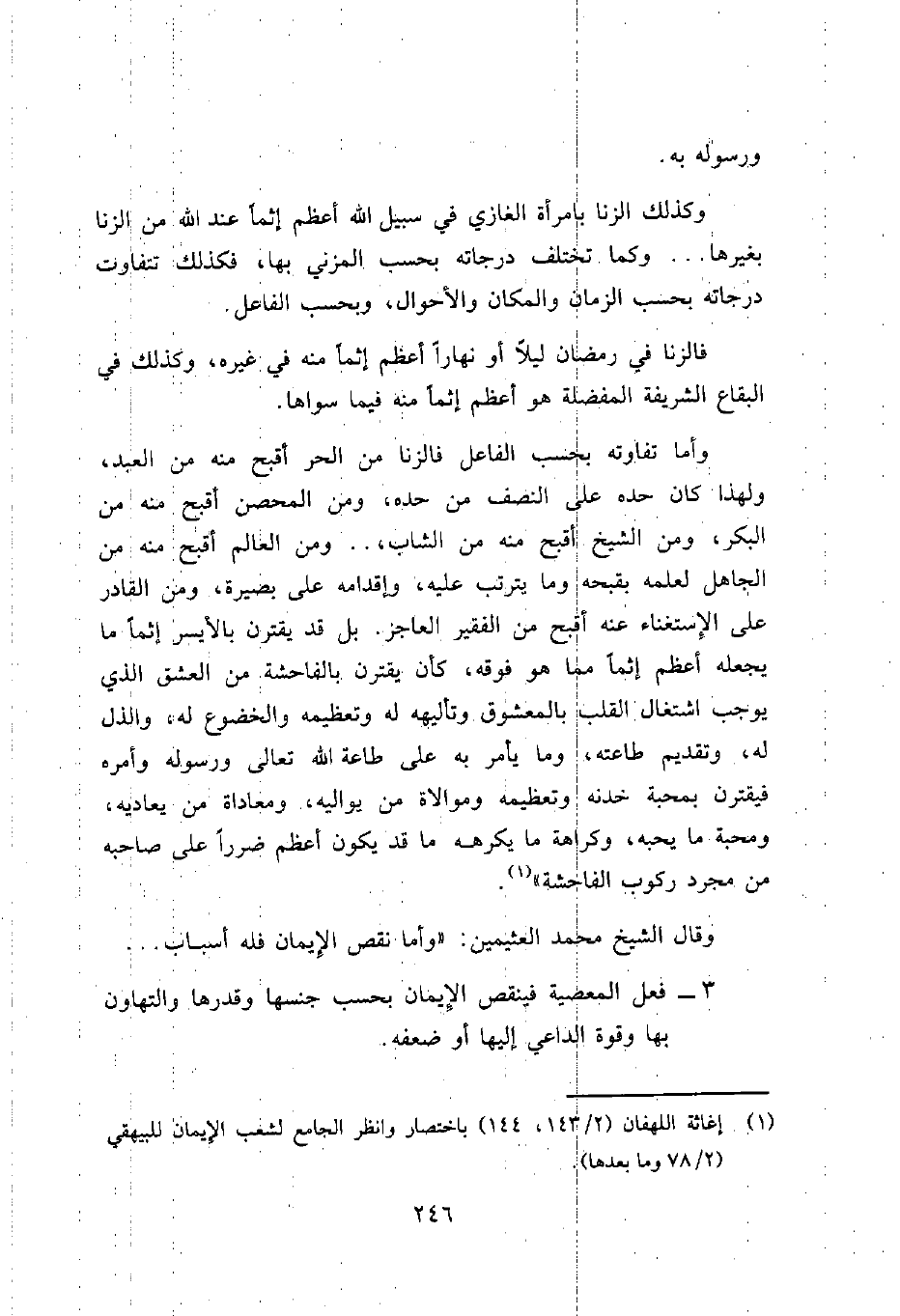 وكذلك الزنا بامرأة الغازي في سبيل الله أعظم إثماً عند الله من الزنا بغيرها ... وكما تختلف درجاته بحسب المزني بها، فكذلك تتفاوت درجاته بحسب الزمان والمكان والأحوال، وبحسب الفاعل.