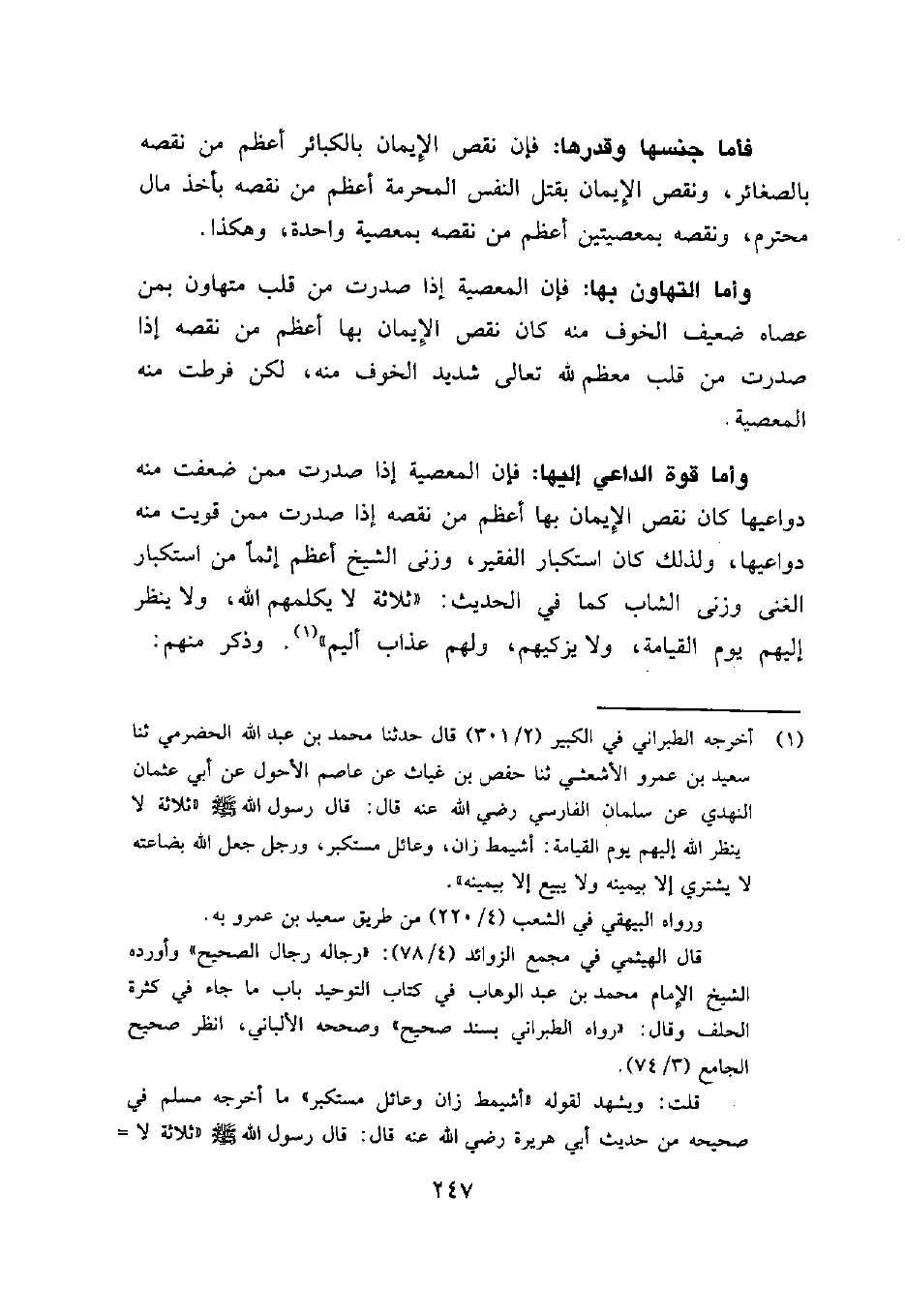 وأما قوة الداعي إليها: فإن المعصية إذا صدرت ممن ضعفت منه دواعيها كان نقص الإيمان بها أعظم من نقصه إذا صدرت ممن قويت منه دواعيها، ولذلك كان استكبار الفقير، وزنى الشيخ أعظم إثماً من استكبار الغنى وزنى الشاب كما في الحديث:"ثلاثة لا يكلمهم الله، ولا ينظر إليهم يوم القيامة، ولا يزكيهم، ولهم عذاب أليم" 1. وذكر منهم: