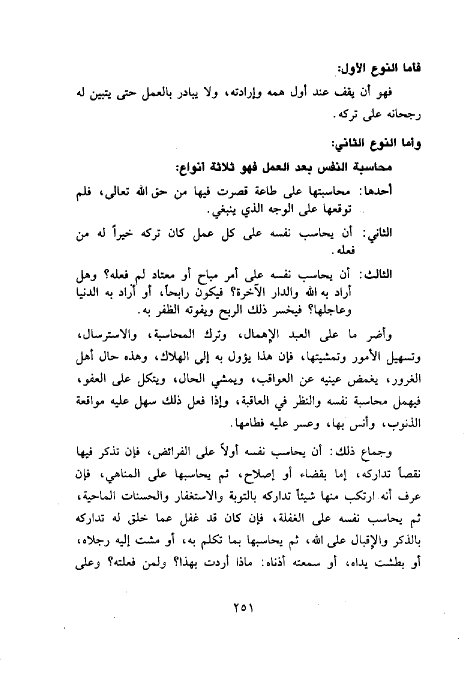 الثالث: أن يحاسب نفسه على أمر مباح أو معتاد لم فعله؟ وهل أراد به الله والدار الآخرة؟ فيكون رابحا، أو أزاد به الدنيا وعاجلها؟ فيخسر ذلك الربح ويفوته الظفر به.