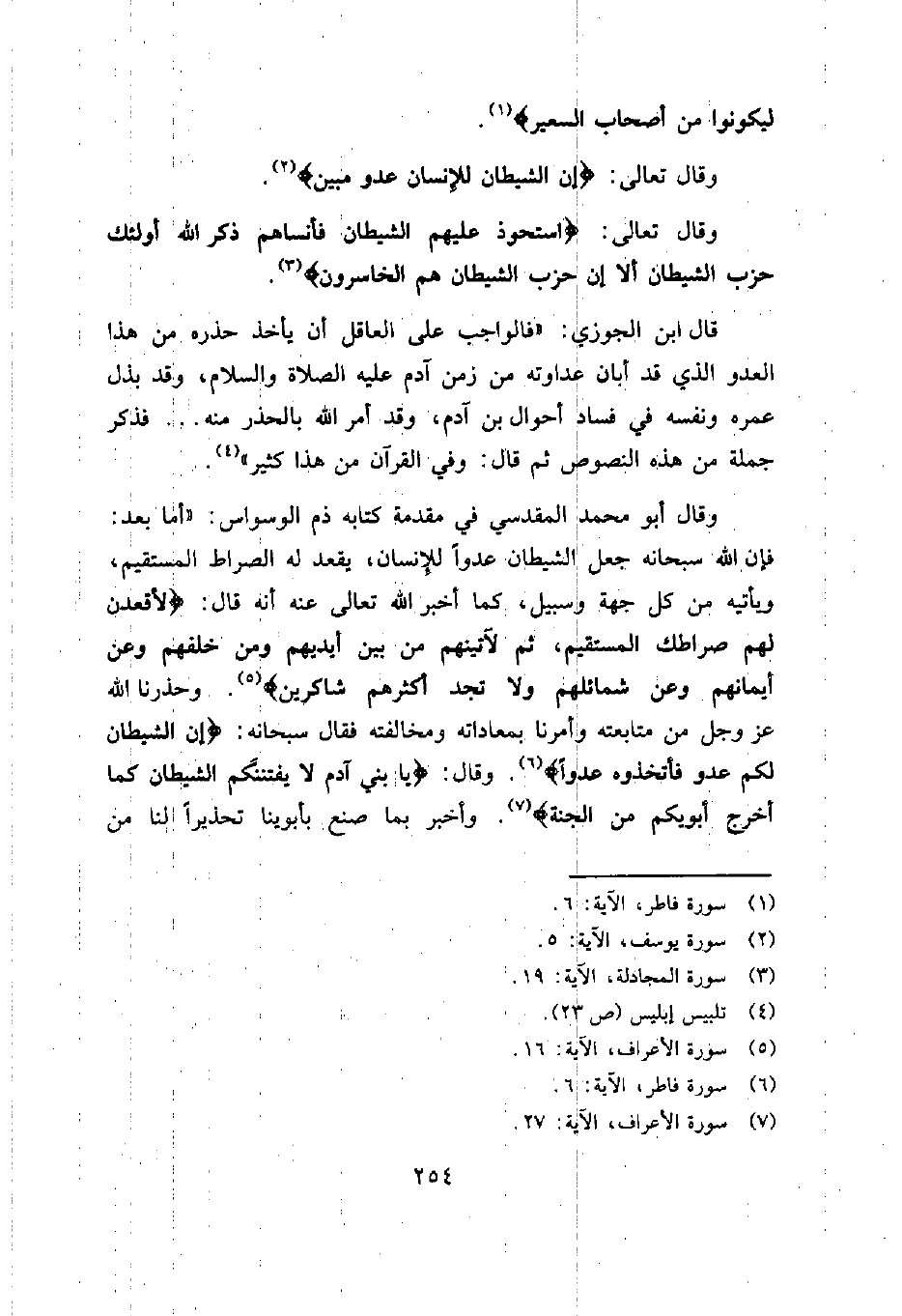 وقال أبو محمد المقدسي في مقدمة كتابه ذم الوسواس:"أما بعد: فإن الله سبحانه جعل الشيطان عدوا للإنسان، يقعد له الصراط المستقيم، ويأتيه من كل جهة وسبيل، كما أخبر الله تعالى عنه أنه قال: {لأَقْعُدَنَّ لَهُمْ صِرَاطَكَ الْمُسْتَقِيمَ * ثُمَّ لآتِيَنَّهُمْ مِنْ بَيْنِ أَيْدِيهِمْ وَمِنْ خَلْفِهِمْ وَعَنْ أَيْمَانِهِمْ وَعَنْ شَمَائِلِهِمْ وَلا تَجِدُ أَكْثَرَهُمْ شَاكِرِينَ} 5. وحذرنا الله عز وجل من متابعته وأمرنا بمعاداته ومخالفته فقال سبحانه: {إِنَّ الشَّيْطَانَ لَكُمْ عَدُوٌّ فَاتَّخِذُوهُ عَدُوّاً} 6 وقال: {أَخْرَجَ أَبَوَيْكُمْ مِنَ الْجَنَّةِ} 7. وأخبر بما صنع بأبوينا تحذيرا لنا من