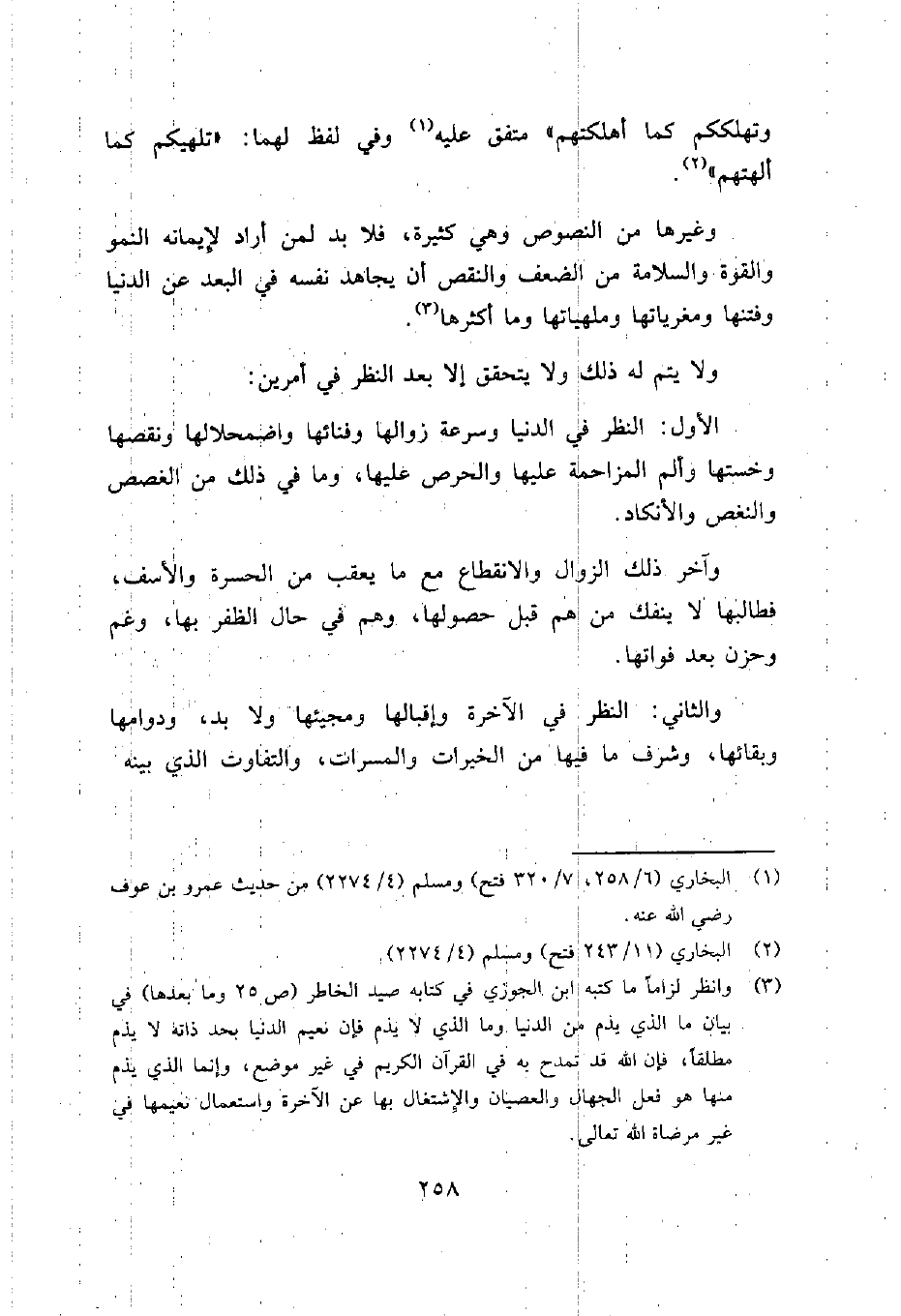 3 وانظر لزاماً ما كتبه ابن الجوزي في كتابه صيد الخاطر (ص 25 وما بعدها) في بيان ما الذي يذم من الدنيا وما الذي لا يذم فإن نعيم الدنيا بحد ذاته لا يذم مطلقاً، فإن الله قد تمدح به في القرآن الكريم في غير موضع، وإنما الذي يذم منها هو فعل الجهال والعصيان والإشتغال بها عن الآخرة واستعمال نعيمها في غير مرضاة الله تعالى.