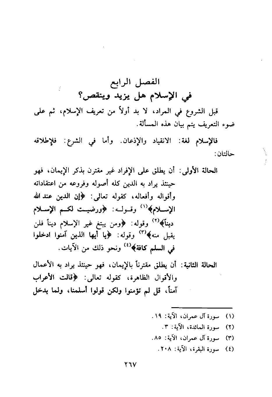 الحالة الأولى: أن يطلق على الإفراد غير مقترن بذكر الإيمان، فهو حينئذ يراد به الدين كله أصوله وفروعه من اعتقاداته وأقواله وأفعاله، كقوله تعالى: {إِنَّ الدِّينَ عِنْدَ اللَّهِ الإسلام} 1 وقوله: {وَرَضِيتُ لَكُمُ الإسلام دِيناً} 2 وقوله: {وَمَنْ يَبْتَغِ غَيْرَ الإسلام دِيناً فَلَنْ يُقْبَلَ مِنْهُ} 3 وقوله: {يَا أَيُّهَا الَّذِينَ آمَنُوا ادْخُلُوا فِي السِّلْمِ كَافَّةً} 4 ونحو ذلك من الآيات.