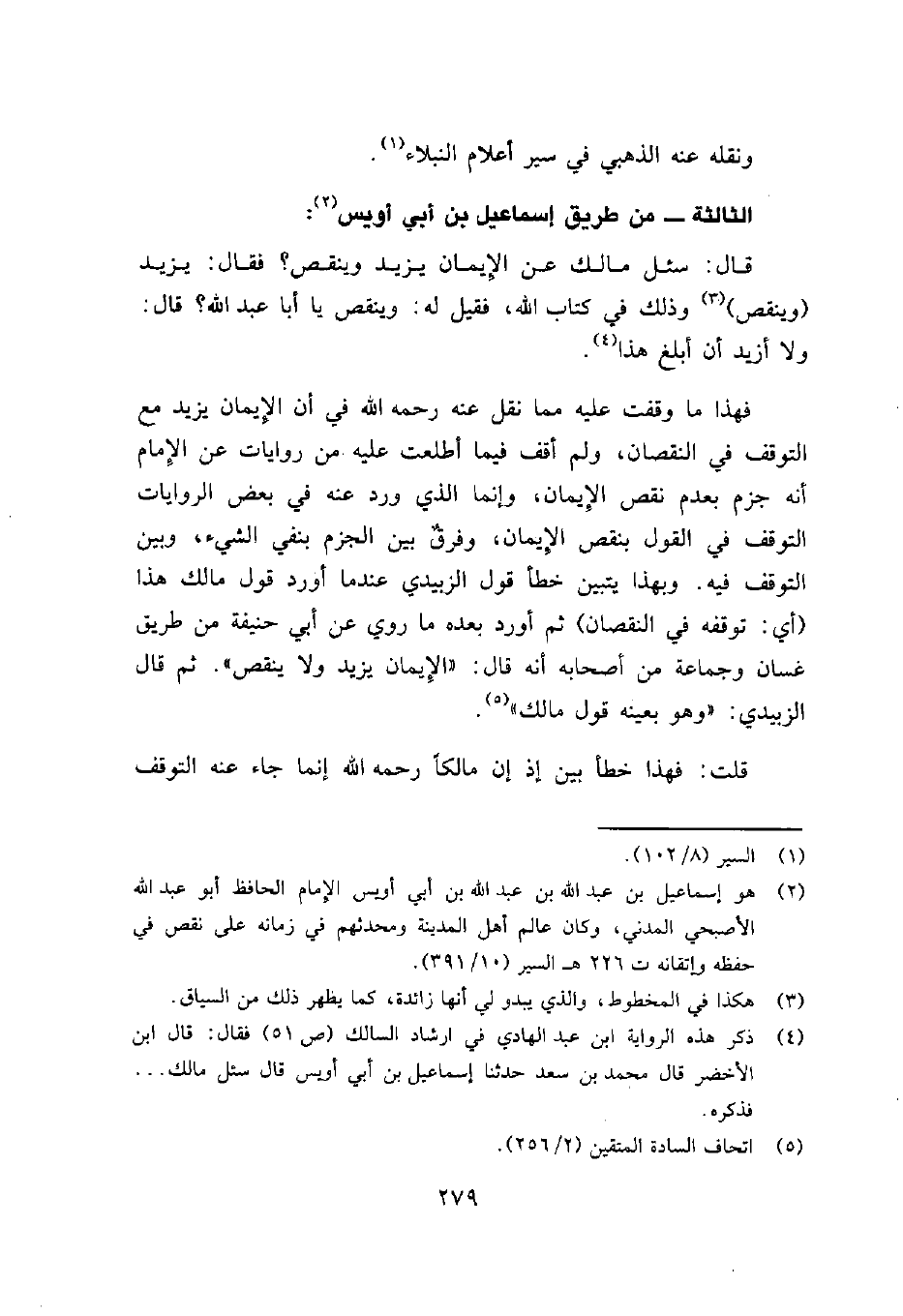 فهذا ما وقفت عليه مما نقل عنه رحمه الله في أن الإيمان يزيد مع التوقف في النقصان، ولم أقف فيما أطلعت عليه من روايات عن الإمام أنه جزم بعدم نقص الإيمان، وإنما الذي ورد عنه في بعض الروايات التوقف في القول بنقص الإيمان، وفرقٌ بين الجزم بنفي الشيء، وبين التوقف فيه. وبهذا يتبين خطأ قول الزبيدي عندما أورد قول مالك هذا (أي: توقفه في النقصان) ثم أورد بعده ما روي عن أبي حنيفة من طريق غسان وجماعة من أصحابه أنه قال:"الإيمان يزيد ولا ينقص". ثم قال الزبيدي:"وهو بعينه قول مالك"5.