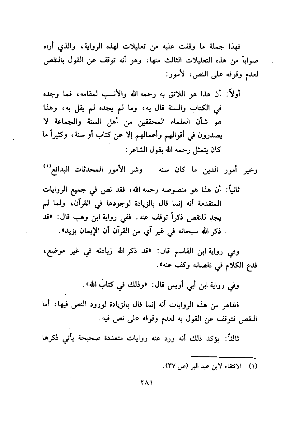 ثانياً: أن هذا هو منصوصه رحمه الله، فقد نص في جميع الروايات المتقدمة أنه إنما قال بالزيادة لوجودها في القرآن، ولما لم يجد للنقص ذكراً توقف عنه. ففي رواية ابن وهب قال:"قد ذكر الله سبحانه في غير آي من القران أن الإيمان يزيد".