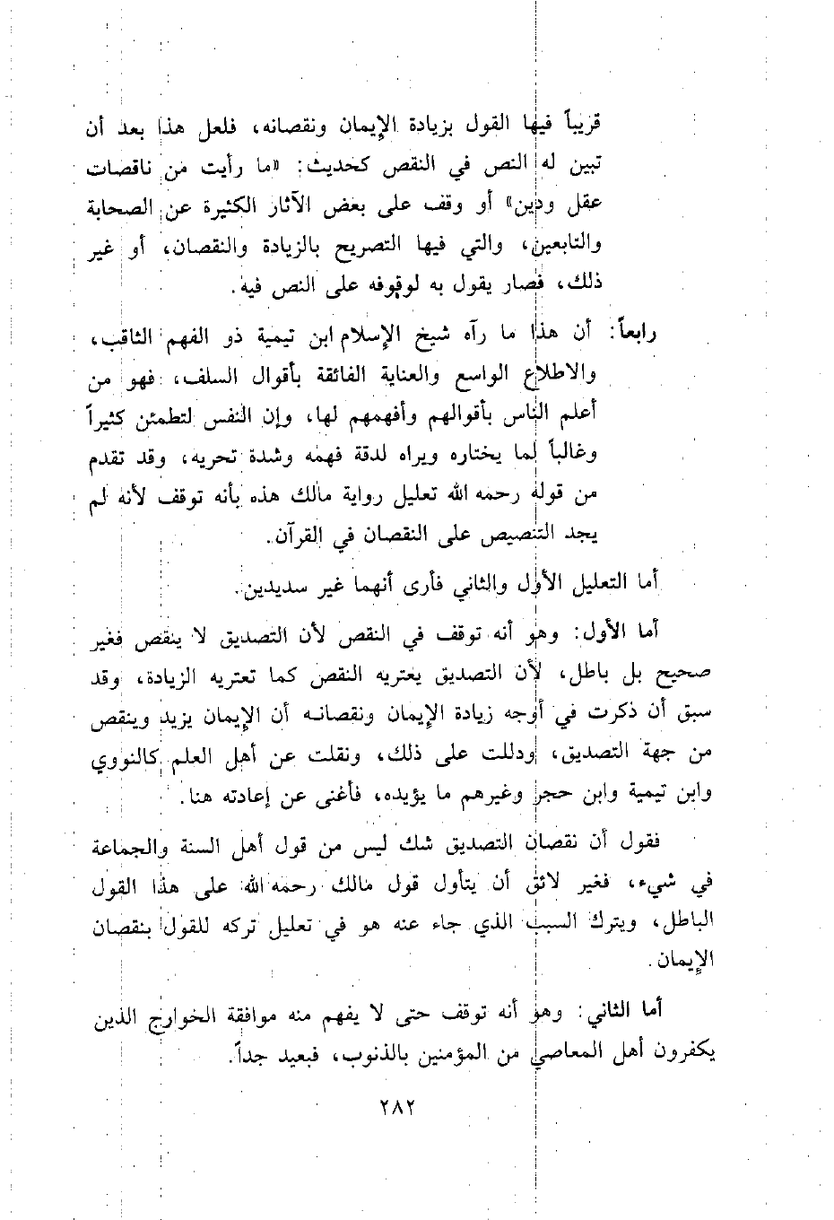 رابعاً: أن هذا ما رآه شيخ الإسلام ابن تيمية ذو الفهم الثاقب، والإطلاع الواسع والعناية الفائقة بأقوال السلف، فهو من أعلم الناس بأقوالهم وأفهمهم لها، وإن النفس لتطمئن كثيراً وغالباً لما يختاره ويراه لدقة فهمه وشدة تحريه، وقد تقدم من قوله رحمه الله تعليل رواية مالك هذه بأنه توقف لأنه لم يجد التنصيص على النقصان في القران.