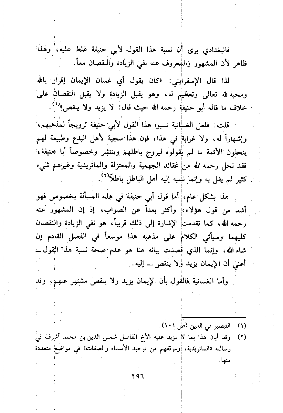 فالبغدادي يرى أن نسبة هذا القول لأبي حنيفة غلط عليه، وهذا ظاهر لأن المشهور والمعروف عنه نفي الزيادة والنقصان معاً.