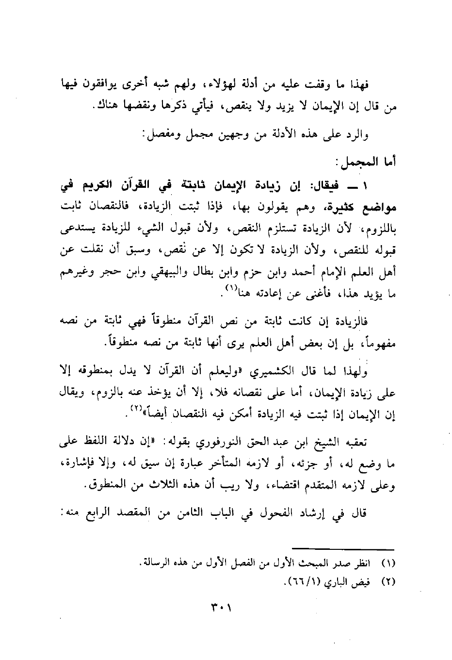 ولهذا لما قال الكشميري "وليعلم أن القرآن لا يدل بمنطوقه إلا على زيادة الإيمان، أما على نقصانه فلا، إلا أن يؤخذ عنه بالزوم، ويقال إن الإيمان إذا ثبتت فيه الزيادة أمكن فيه النقصان أيضاً"2.