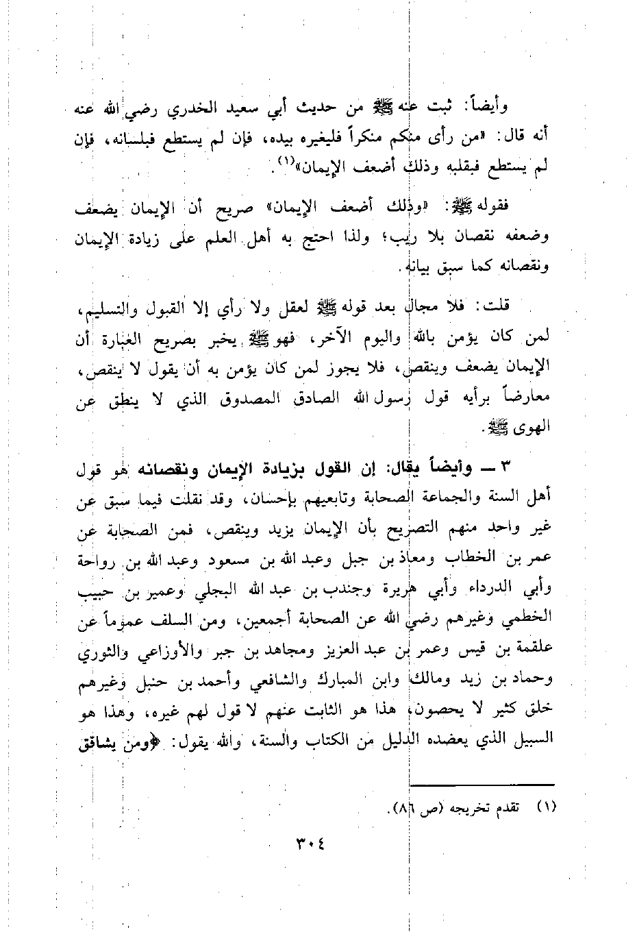 3- وأيضاً يقال: إن القول بزيادة الإيمان ونقصانه هو قول أهل السنة والجماعة الصحابة وتابعيهم بإحسان، وقد نقلت فيما سبق عن غير واحد منهم التصريح بأن الإيمان يزيد وينقص، فمن الصحابة عن عمر بن الخطاب ومعاذ بن جبل وعبد الله بن مسعود وعبد الله بن رواحة وأبي الدرداء وأبي هريرة وجندب بن عبد الله البجلي وعمير بن حبيب الخطمي وغيرهم رضي الله عن الصحابة أجمعين، ومن السلف عموماً عن علقمة بن قيس وعمر بن عبد العزيز ومجاهد بن جبر والأوزاعي والثوري وحماد بن زيد ومالك وابن المبارك والشافعي وأحمد بن حنبل وغيرهم خلق كثير لا يحصون، هذا هو الثابت عنهم لا قول لهم غيره، وهذا هو السبيل الذي يعضده الدليل من الكتاب والسنة، والله يقول: {وَمَنْ يُشَاقِقِ