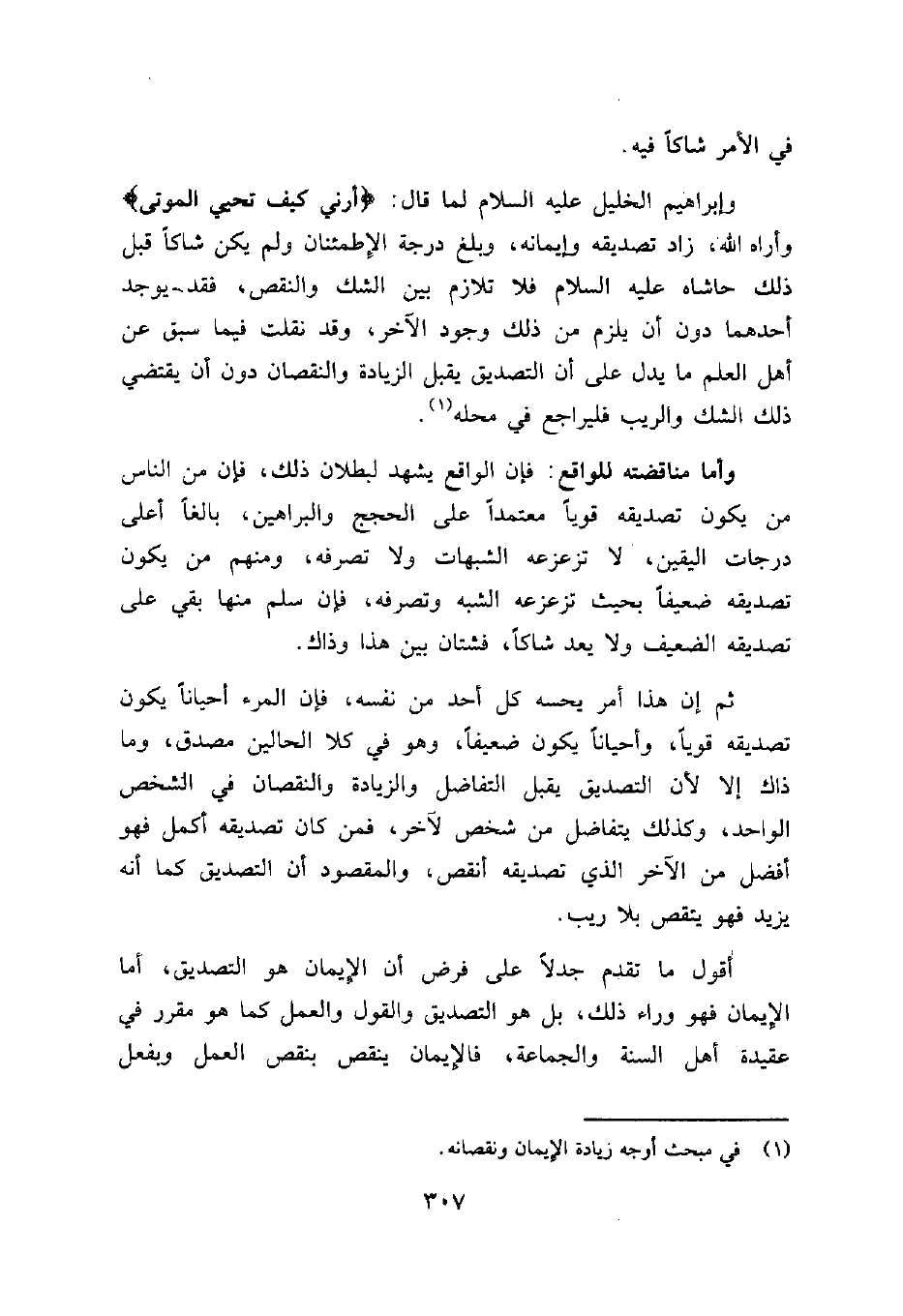 وإبراهيم الخليل عليه السلام لما قال: {أَرِنِي كَيْفَ تُحْيِي الْمَوْتَى} وأراه الله، زاد تصديقه وإيمانه، وبلغ درجة الاطمئنان ولم يكن شاكاً قبل ذلك حاشاه عليه السلام فلا تلازم بين الشك والنقص، فقد يوجد أحدهما دون أن يلزم من ذلك وجود الآخر، وقد نقلت فيما سبق عن أهل العلم ما يدل على أن التصديق يقبل الزيادة والنقصان دون أن يقتضي ذلك الشك والريب فليراجع في محله1.