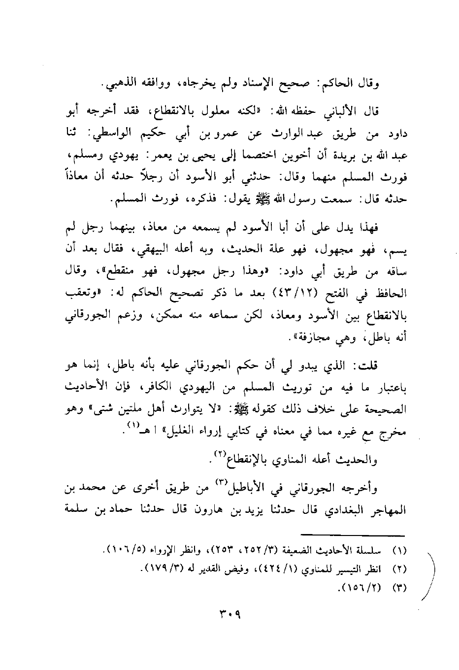 قال الألباني حفظه الله: "لكنه معلول بالانقطاع، فقد أخرجه أبو داود من طريق عبد الوارث عن عمرو بن أبي حكيم الواسطي: ثنا عبد الله بن بريدة أن أخوين اختصما إلى يحيى بن يعمر: يهودي ومسلم، فورث المسلم منهما وقال: حدثني أبو الأسود أن رجلاً حدثه أن معاذاً حدثه قال: سمعت رسول الله صلى الله عليه وسلم يقول: فذكره، فورث المسلم.