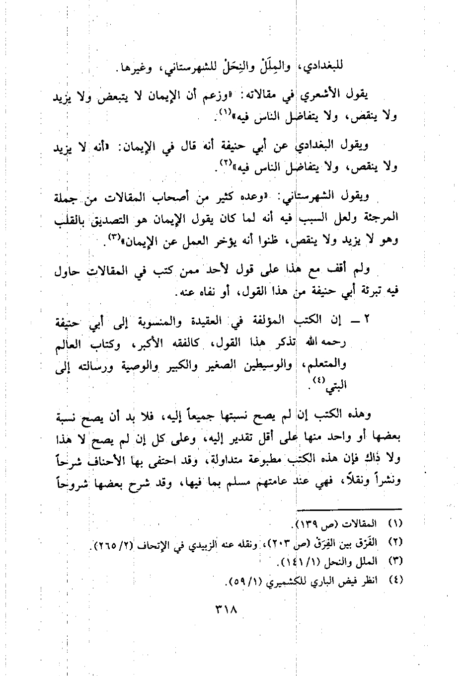 2- إن الكتب المؤلفة في العقيدة والمنسوبة إلى أبي حنيفة رحمه الله تذكر هذا القول، كالفقه الأكبر، وكتاب العالم والمتعلم، والوسيطين الصغير والكبير والوصية ورسالته إلى البتي4.