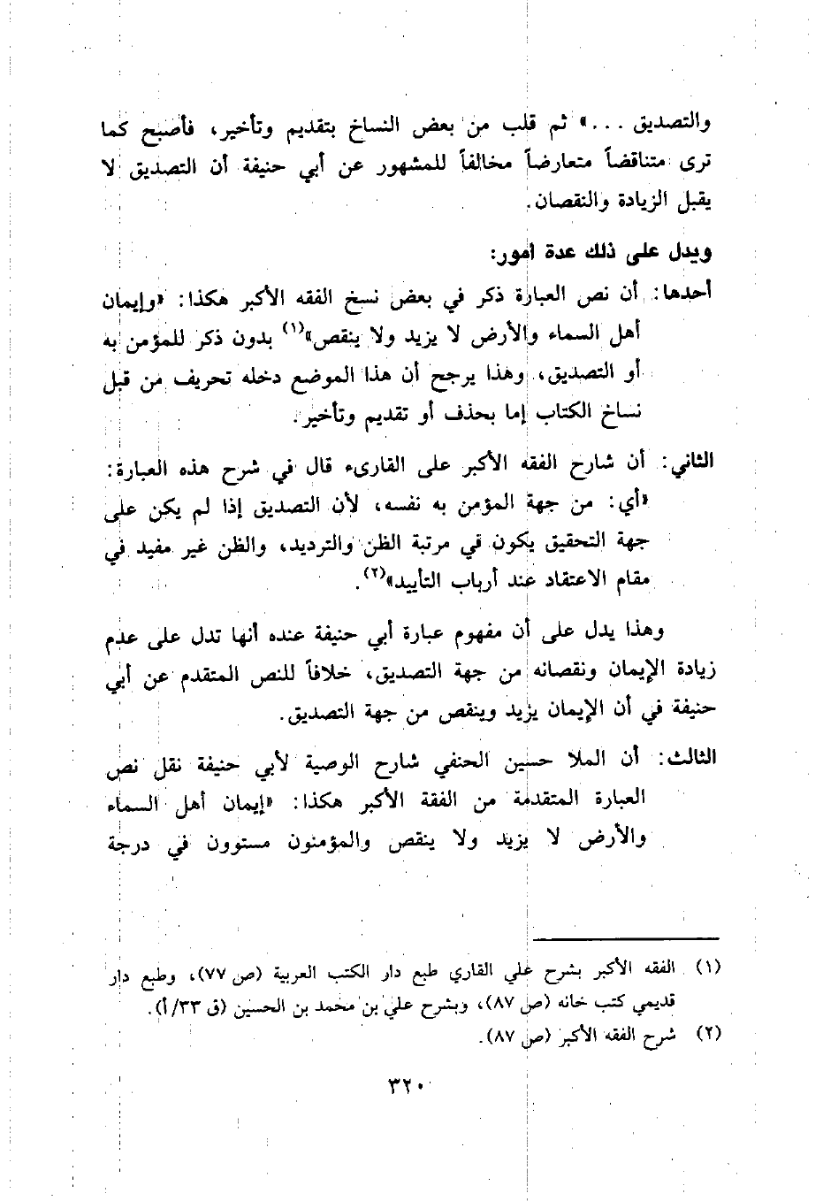 1 الففه الأكبر لشرح علي القاري طبع دار الكتب العربية (ص 77) ، وطبع دار قديمي كتب خانه (ص 87) ، وبشرح علي بن محمد بن الحسين (ق 33/أ) .