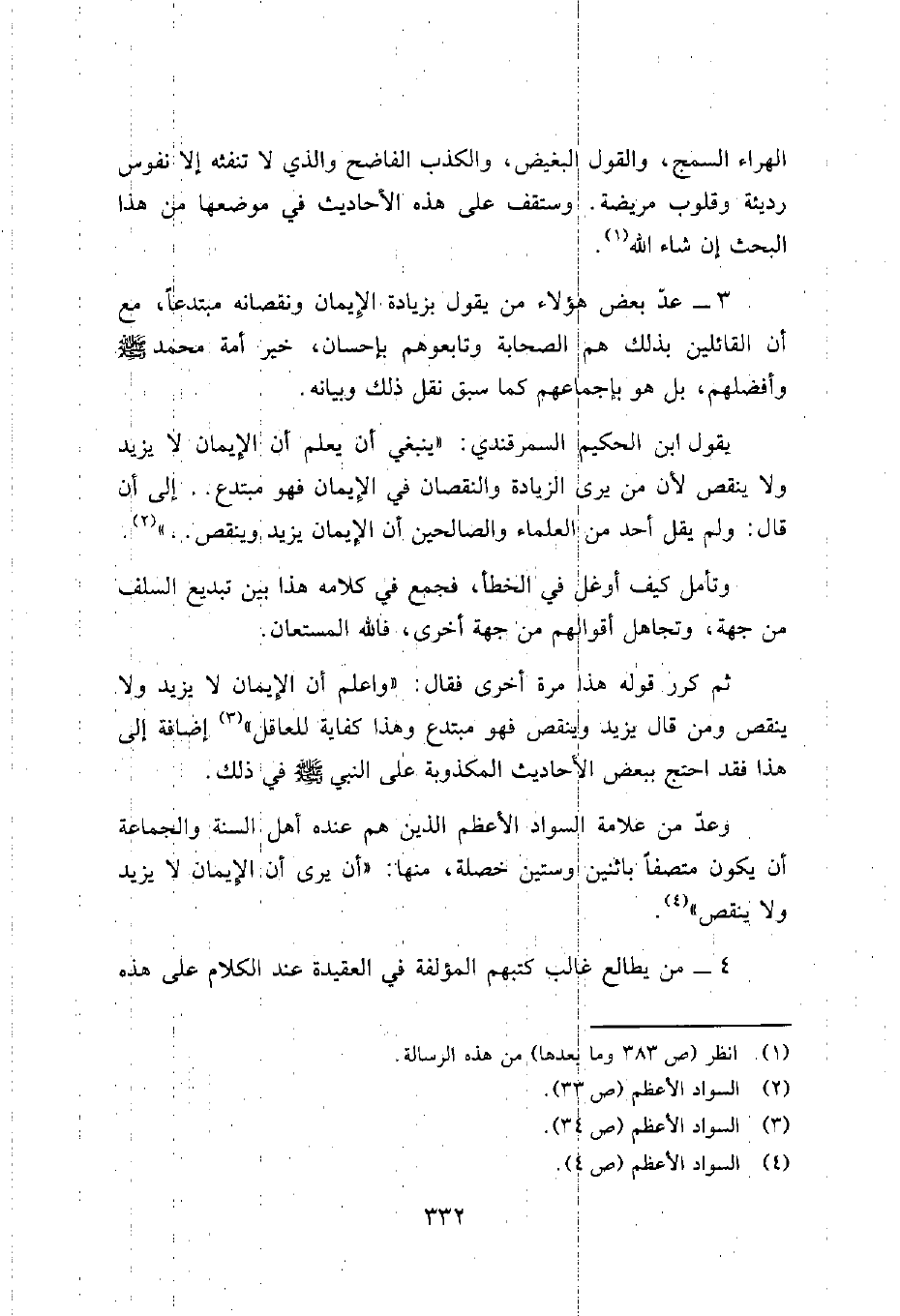 وعدّ من علامة السواد الأعظم الذين هم عنده أهل السنة والجماعة أن يكون متصفاً باثنين وستين خصلة، منها: "أن يرى أن الإيمان لا يزيد ولا ينقص"4.