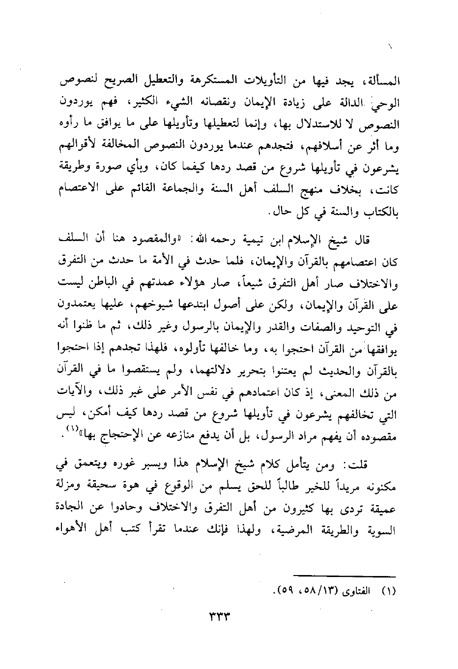 المسألة، يجد فيها من التأويلات المستكرهة والتعطيل الصريح لنصوص الوحي الدالة على زيادة الإيمان ونقصانه الشيء الكثير، فهم يوردون النصوص لا للاستدلال بها، وإنما لتعطيلهما وتأويلها على ما يوافق ما رأوه وما أثر عن أسلافهم، فتجدهم عندما يوردون النصوص المخالفة لأقوالهم يشرعون في تأويلها شروع من قصد ردها كيفما كان، وبأي صورة وطريقة كانت، بخلاف منهج السلف أهل السنة والجماعة القائم على الاعتصام بالكتاب والسنة في كل حال.