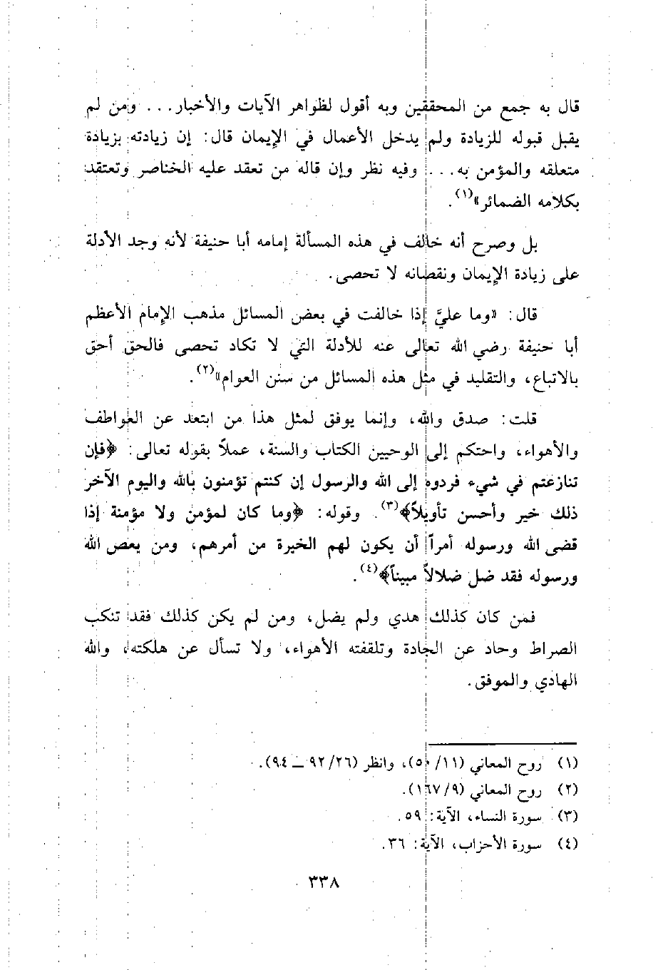 بل وصرح أنه خالف في هذه المسألة إمامه أبا حنيفة لأنه وجد الأدلة على زيادة الإيمان ونقصانه لا تحصى.