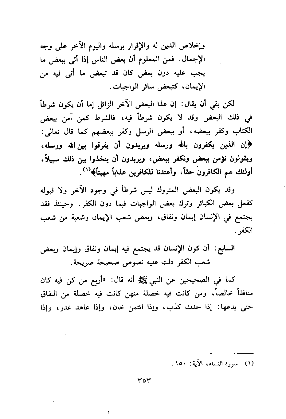 لكن بقي أن يقال: إن هذا البعض الآخر الزائل إما أن يكون شرطاً في ذلك البعض وقد لا يكون شرطاً فيه، فالشرط كمن آمن ببعض الكتاب وكفر ببعضه، أو ببعض الرسل وكفر ببعضهم كما قال تعالى: {إِنَّ الَّذِينَ يَكْفُرُونَ بِاللَّهِ وَرُسُلِهِ وَيُرِيدُونَ أَنْ يُفَرِّقُوا بَيْنَ اللَّهِ وَرُسُلِهِ وَيَقُولُونَ نُؤْمِنُ بِبَعْضٍ وَنَكْفُرُ بِبَعْضٍ وَيُرِيدُونَ أَنْ يَتَّخِذُوا بَيْنَ ذَلِكَ سَبِيلاً * أُولَئِكَ هُمُ الْكَافِرُونَ حَقّاً وَأَعْتَدْنَا لِلْكَافِرِينَ عَذَاباً مُهِيناً} 1.