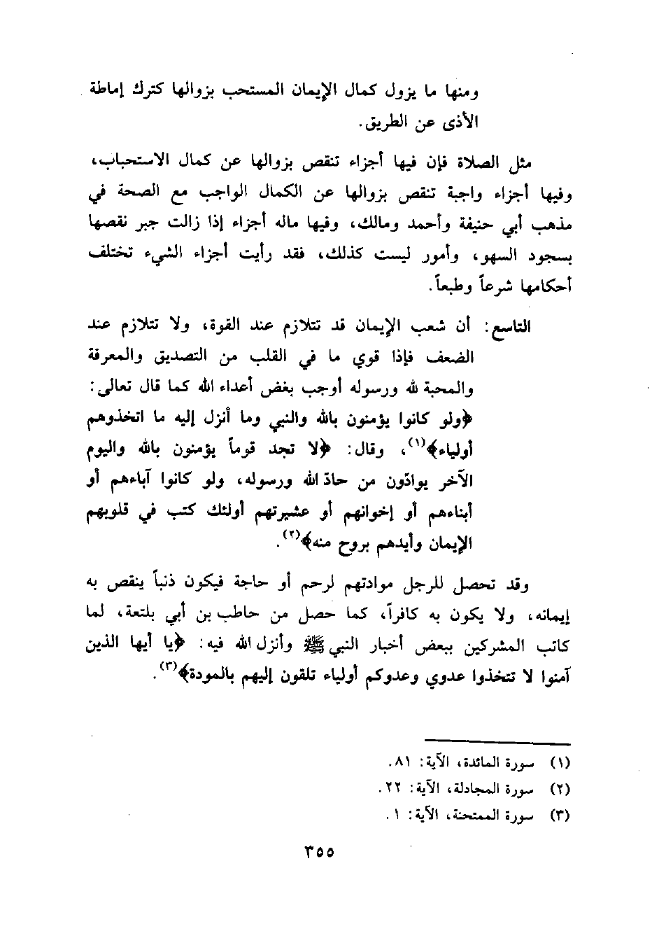 التاسع: أن شعب الإيمان قد تتلازم عند القوة، ولا تتلازم عند الضعف فإذا قوي ما في القلب من التصديق والمعرفة والمحبة لله ورسوله أوجب بغض أعداء الله كما قال تعالى: {وَلَوْ كَانُوا يُؤْمِنُونَ بِاللَّهِ وَالنَّبِيِّ وَمَا أُنْزِلَ إِلَيْهِ مَا اتَّخَذُوهُمْ أَوْلِيَاءَ} 1، وقال: {لا تَجِدُ قَوْماً يُؤْمِنُونَ بِاللَّهِ وَالْيَوْمِ الْآخِرِ يُوَادُّونَ مَنْ حَادَّ اللَّهَ وَرَسُولَهُ وَلَوْ كَانُوا آبَاءَهُمْ أَوْ أَبْنَاءَهُمْ أَوْ إِخْوَانَهُمْ أَوْ عَشِيرَتَهُمْ أُولَئِكَ كَتَبَ فِي قُلُوبِهِمُ الإيمان وَأَيَّدَهُمْ بِرُوحٍ مِنْهُ} 2.