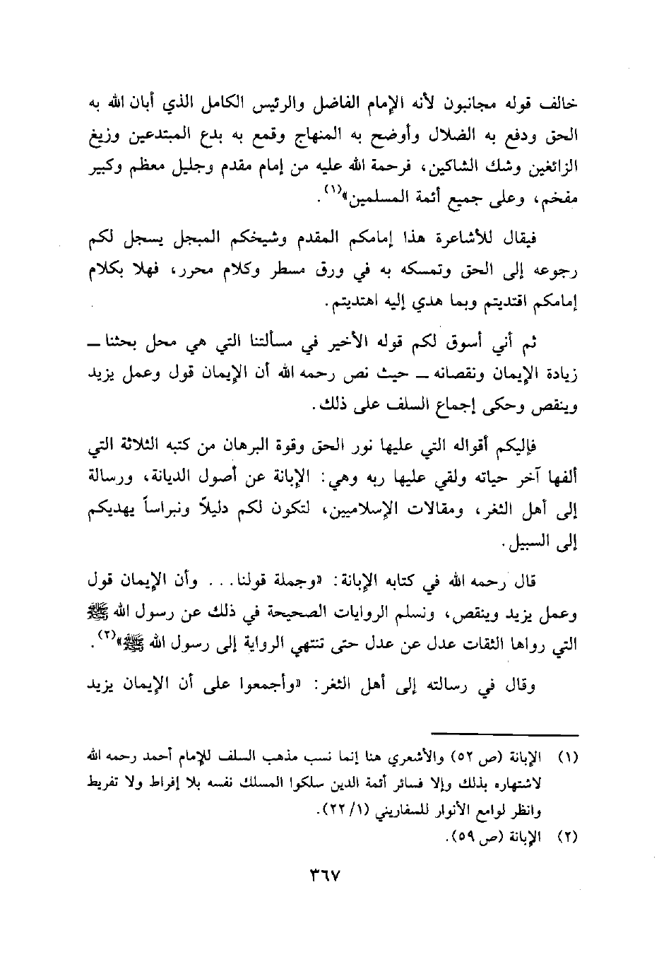 1 الإبانة (ص 52) والأشعري هنا إنما نسب مذهب السلف للإمام أحمد رحمه الله لاشتهاره بذلك وإلا فسائر أئمة الدين سلكوا المسلك نفسه بلا إفراط ولا تفريط وانظر لوامع الأنوار للسفاريني (1/ 22) .