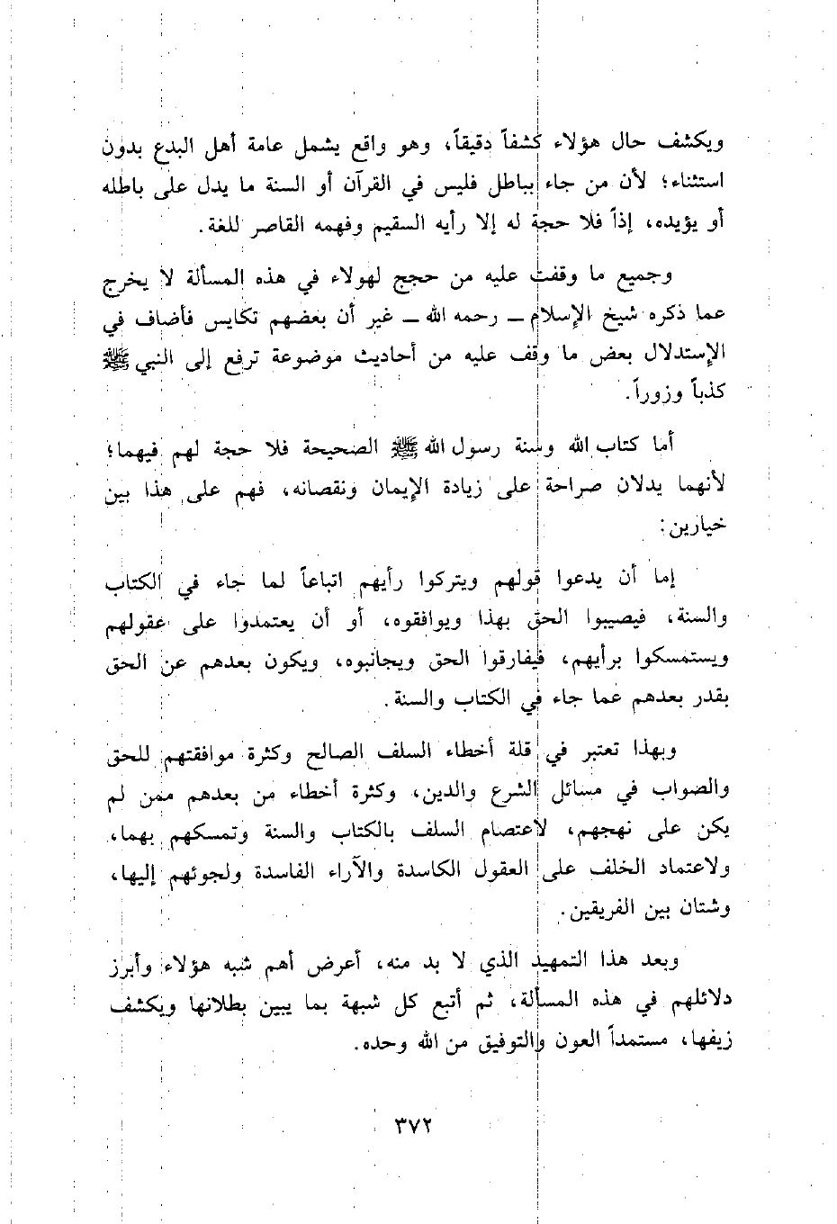 أما كتاب الله وسنة رسول الله صلى الله عليه وسلم الصحيحة فلا حجة لهم فيهما؛ لأنهما يدلان صراحة على زيادة الإيمان ونقصانه، فهم على هذا بين خيارين: