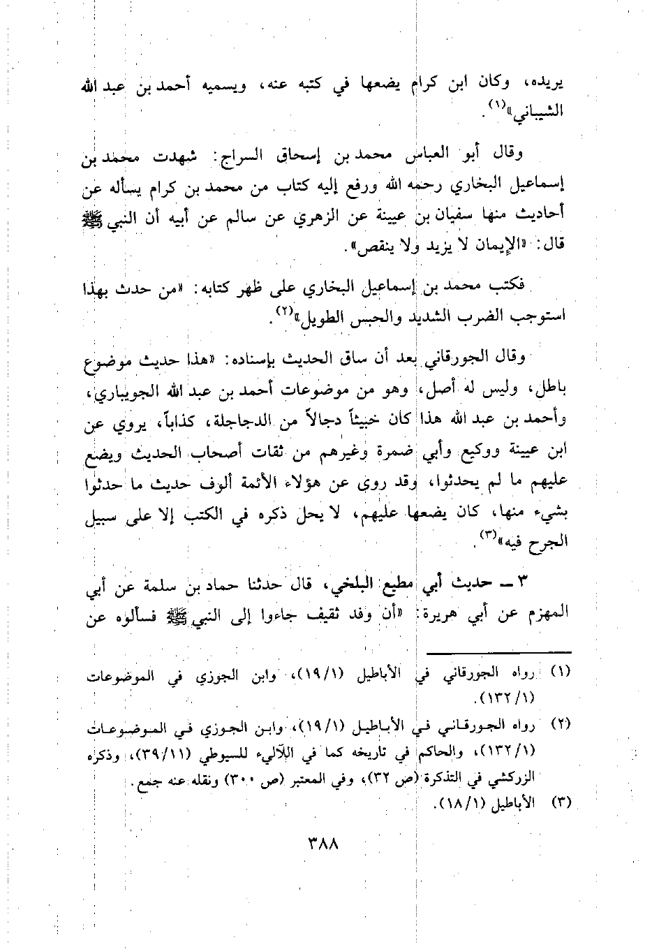 وقال أبو العباس محمد بن إسحاق السراج: شهدت محمد بن إسماعيل البخاري رحمه الله ورفع إليه كتاب من محمد بن كرام يسأله عن أحاديث منها سفيان بن عيينة عن الزهري عن سالم عن أبيه أن النبي صلى الله عليه وسلم قال: "الإيمان لا يزيد ولا ينقص".