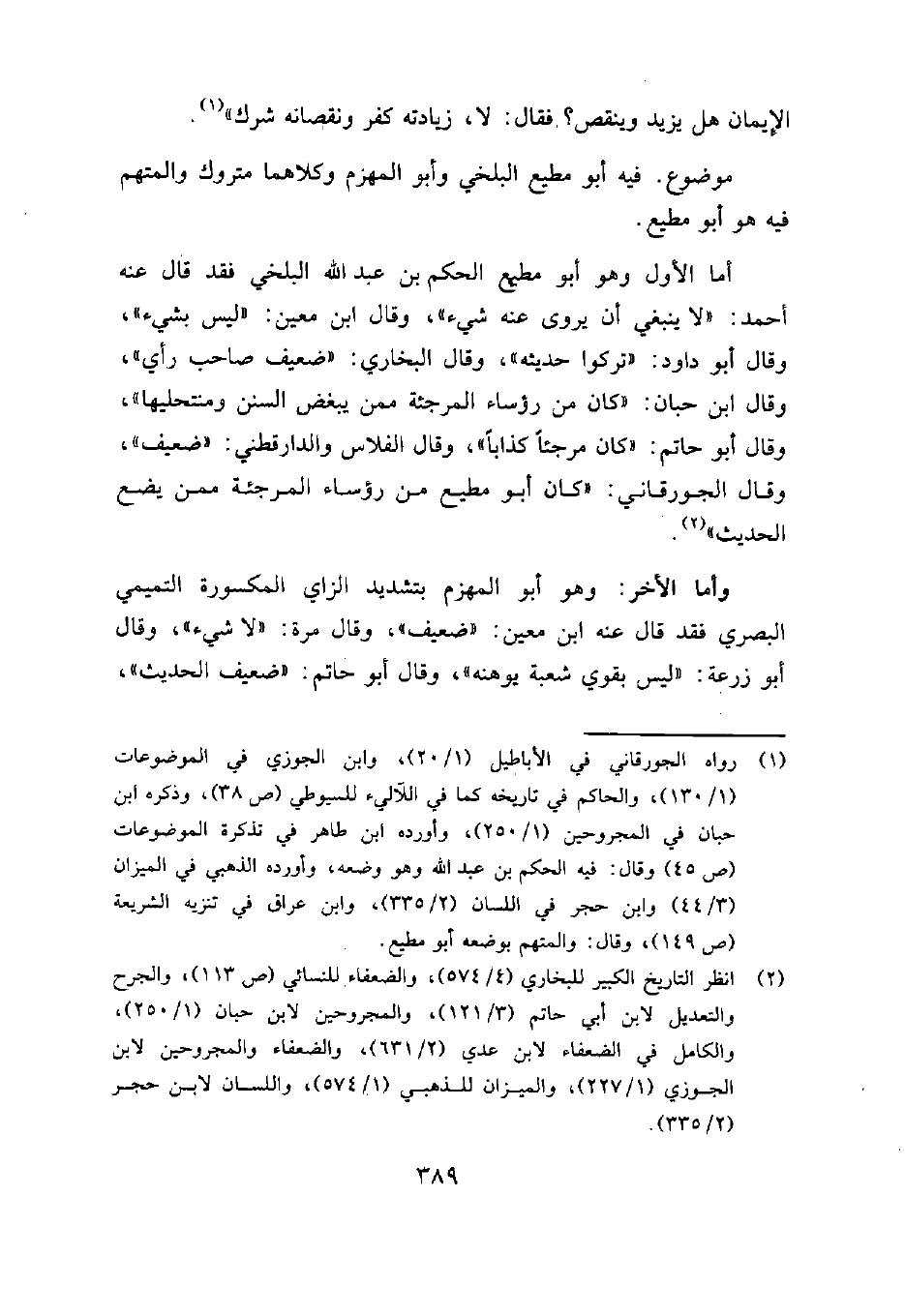 أما الأول وهو أبو مطيع الحكم بن عبد الله البلخي فقد قال عنه أحمد: "لا ينبغي أن يروى عنه شيء"، وقال ابن معين: "ليس بشيء"، وقال أبو داود: "تركوا حديثه"، وقال البخاري: "ضعيف صاحب رأي"، وقال ابن حبان: "كان من رؤساء المرجئة ممن يبغض السنن ومنتحليها"، وقال أبو حاتم: "كان مرجئاً كذاباً"، وقال الفلاس والدارقطني: "ضعيف"، وقال الجورقاني: "كان أبو مطيع من رؤساء المرجئة ممن يضع الحديث"2.