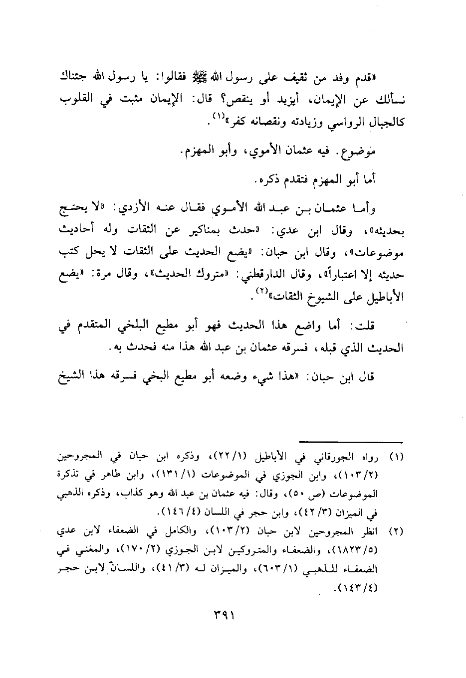 وأما عثمان بن عبد الله الأموي فقال عنه الأزدي: "لا يحتج بحديثه"، وقال ابن عدي: "حدث بمناكير عن الثقات وله أحاديث موضوعات "، وقال ابن حبان: "يضع الحديث على الثقات لا يحل كتب حديثه إلا اعتباراً"، وقال الدارقطني: "متروك الحديث"، وقال مرة: "يضع الأباطيل على الشيوخ الثقات"2.
