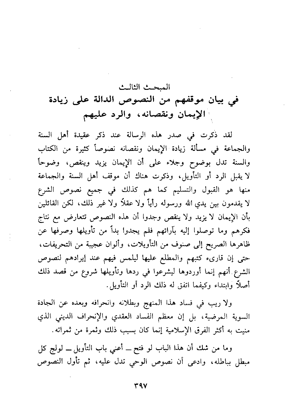 لقد ذكرت في صدر هذه الرسالة عند ذكر عقيدة أهل السنة والجماعة في مسألة زيادة الإيمان ونقصانه نصوصاً كثيرة من الكتاب والسنة تدل بوضوح وجلاء على أن الإيمان يزيد وينقص، وضوحاً لا يقبل الرد أو التأويل، وذكرت هناك أن موقف أهل السنة والجماعة منها هو القبول والتسليم كما هم كذلك في جميع نصوص الشرع لا يقدمون بين يدي الله ورسوله رأياً ولا عقلاً ولا غير ذلك، لكن القائلين بأن الإيمان لا يزيد ولا ينقص وجدوا أن هذه النصوص تتعارض مع نتاج فكرهم وما توصلوا إليه بآرائهم فلم يجدوا بداً من تأويلها وصرفها عن ظاهرها الصريح إلى صنوف من التأويلات، وألوان عجيبة من التحريفات، حتى إن قارىء كتبهم والمطلع عليها ليلمس فيهم عند إيرادهم لنصوص الشرع أنهم إنما أوردوها ليشرعوا في ردها وتأويلها شروع من قصد ذلك أصلاً وابتداء وكيفما اتفق له ذلك الرد أو التأويل.
