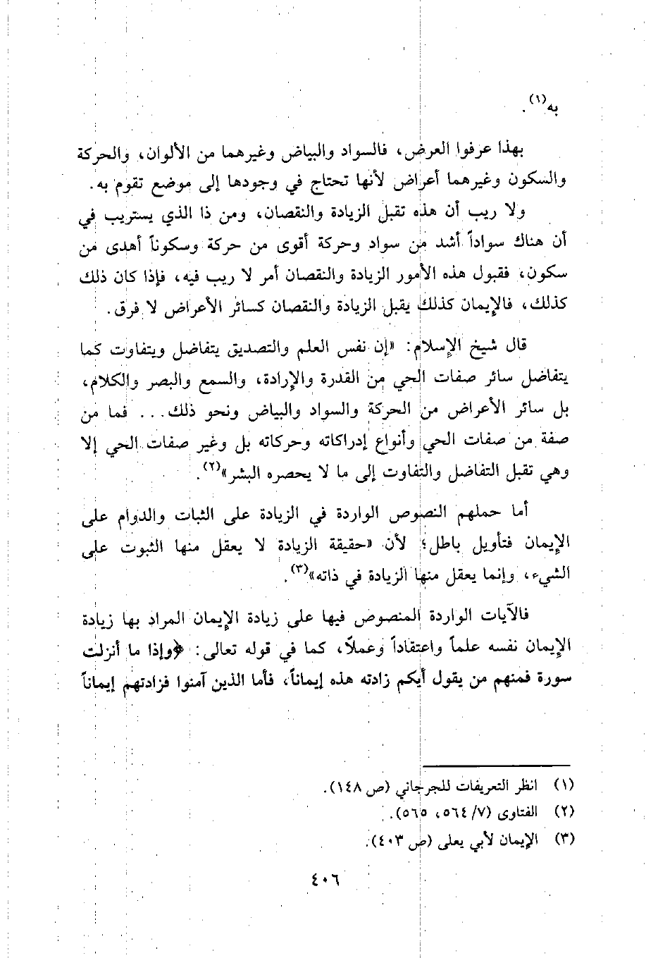 ولا ريب أن هذه تقبل الزيادة والنقصان، ومن ذا الذي يستريب في أن هناك سواداً أشد من سواد وحركة أقوى من حركة وسكوناً أهدى من سكون، فقبول هذه الأمور الزيادة والنقصان أمر لا ريب فيه، فإذا كان ذلك كذلك، فالإيمان كذلك يقبل الزيادة والنقصان كسائر الأعراض لا فرق.