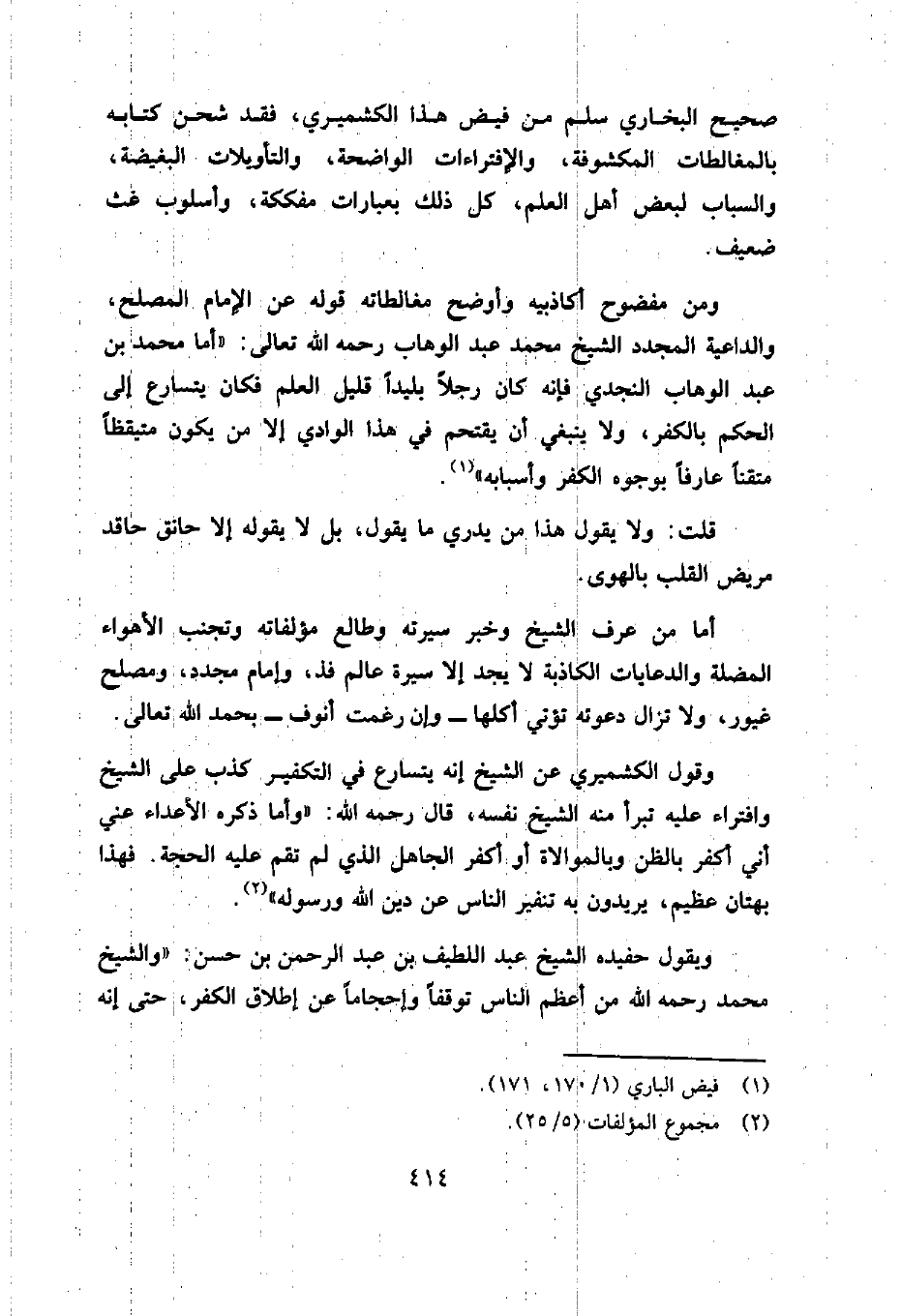 وقول الكشميري عن الشيخ إنه يتسارع في التكفير كذب على الشيخ وافتراء عليه تبرأ منه الشيخ نفسه، قال رحمه الله: "وأما ذكره الأعداء عني أني أكفر بالظن وبالموالاة أو أكفر الجاهل الذي لم تقم عليه الحجة. فهذا بهتان عظيم، يريدون به تنفير الناس عن دين الله ورسوله"2.