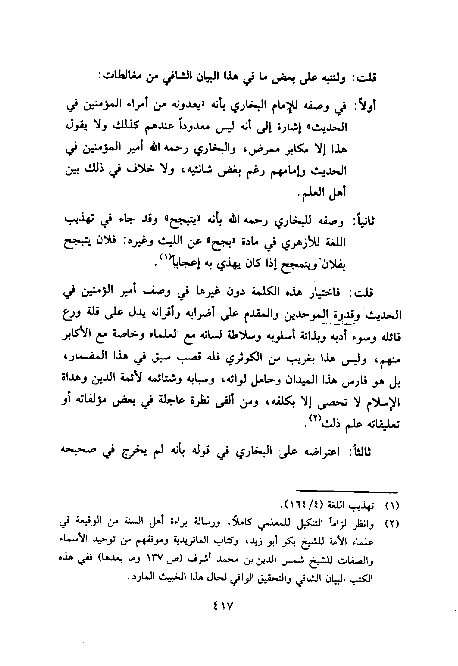 ثانياً: وصفه للبخاري رحمه الله بأنه "يتبجح "وقد جاء في تهذيب اللغة للأزهري في مادة "بجح"عن الليث وغيره: فلان يتبجح بفلان ويتمجح إذا كان يهذي به إعجاباً1.