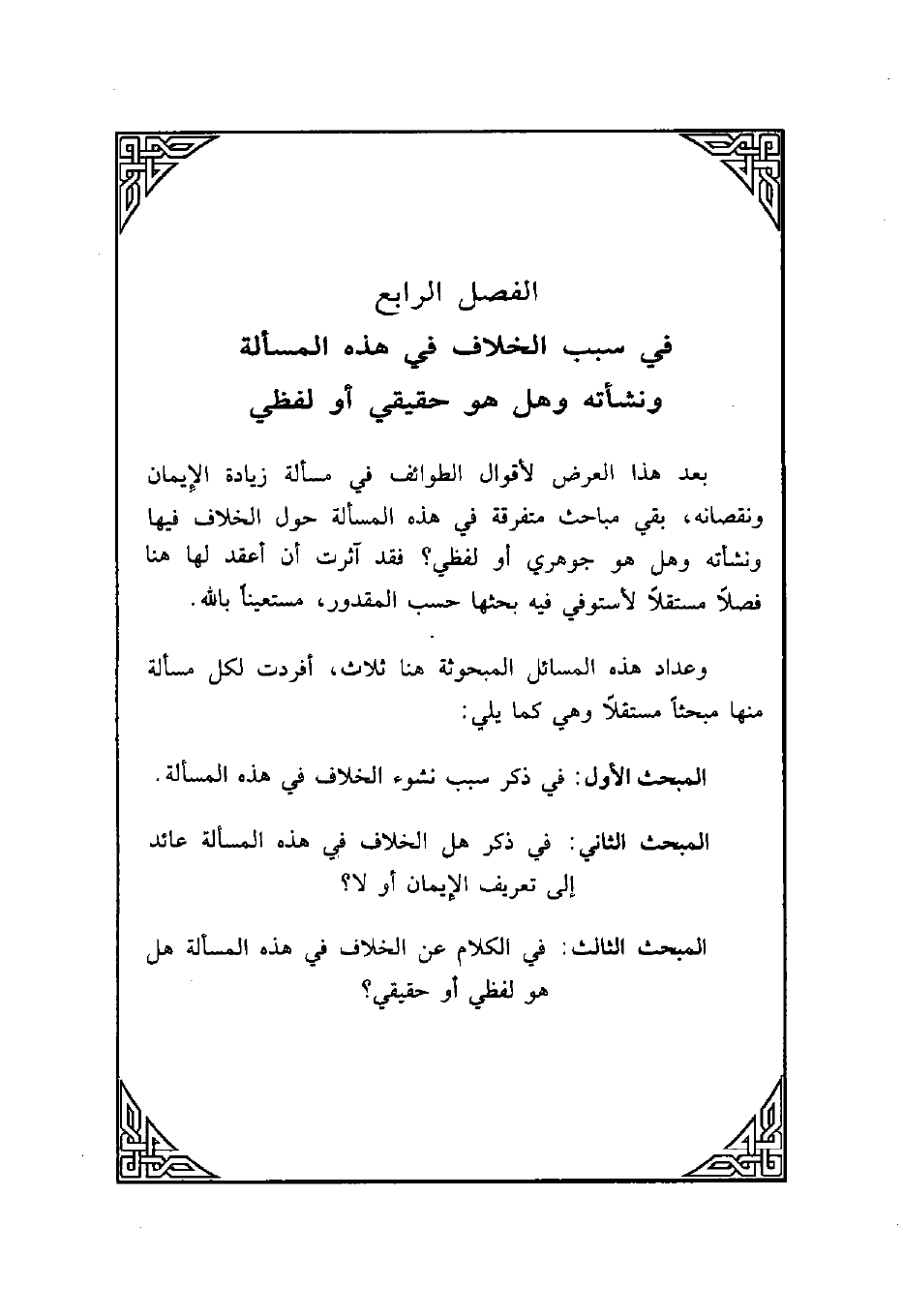بعد هذا العرض لأقوال الطوائف في مسألة زيادة الإيمان ونقصانه، بقي مباحث متفرقة في هذه المسألة حول الخلاف فيها ونشأته وهل هو جوهري أو لفظي؟ فقد آثرت أن أعقد لها هنا فصلاً مستقلاً لأستوفي فيه بحثها حسب المقدور، مستعيناً بالله.
