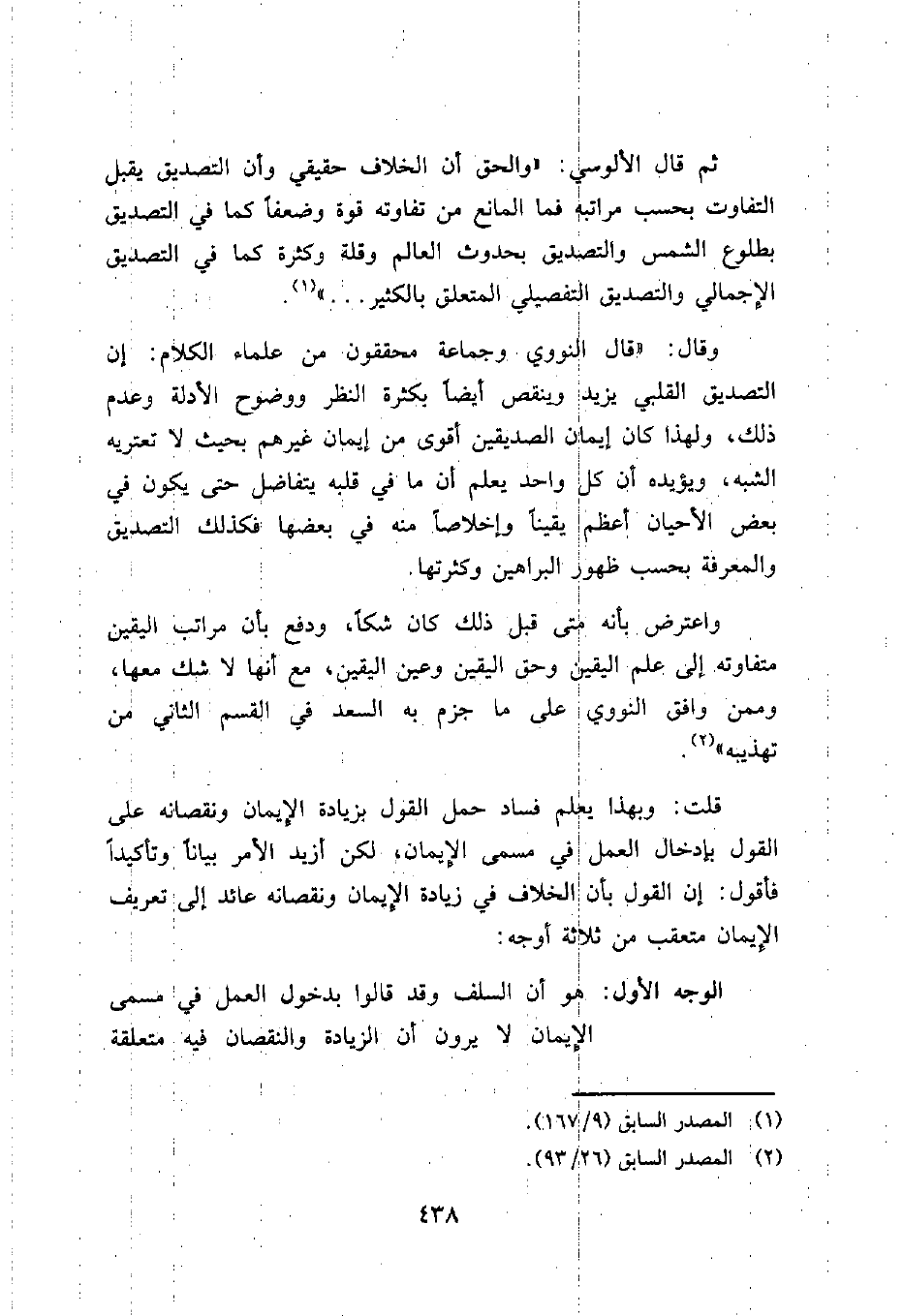 وقال: "قال النووي وجماعة محققون من علماء الكلام: إن التصديق القلبي يزيد وينقص أيضاً بكثرة النظر ووضوح الأدلة وعدم ذلك، ولهذا كان إيمان الصديقين أقوى من إيمان غيرهم بحيث لا تعتريه الشبه، ويؤيده أن كل واحد يعلم أن ما في قلبه يتفاضل حتى يكون في بعض الأحيان أعظم يقيناً وإخلاصاً منه في بعضها فكذلك التصديق والمعرفة بحسب ظهور البراهين وكثرتها.