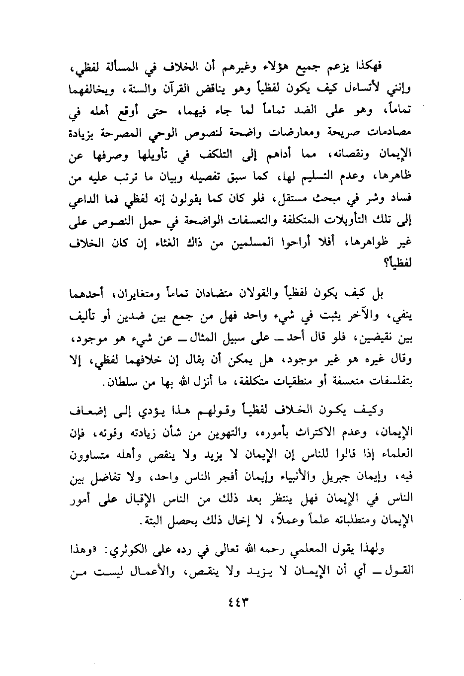 فهكذا يزعم جميع هؤلاء وغيرهم أن الخلاف في المسألة لفظي، وإنني لأتساءل كيف يكون لفظياً وهو يناقض القرآن والسنة، ويخالفهما تماماً، وهو على الضد تماماً لما جاء فيهما، حتى أوقع أهله في مصادمات صريحة ومعارضات واضحة لنصوص الوحي المصرحة بزيادة الإيمان ونقصانه، مما أداهم إلى التكلف في تأويلها وصرفها عن ظاهرها، وعدم التسليم لها، كما سبق تفصيله وبيان ما ترتب عليه من فساد وشر في مبحث مستقل، فلو كان كما يقولون إنه لفظي فما الداعي إلى تلك التأويلات المتكلفة والتعسفات الواضحة في حمل النصوص على غير ظواهرها، أفلا أراحوا المسلمين من ذاك الغثاء إن كان الخلاف لفظياً؟