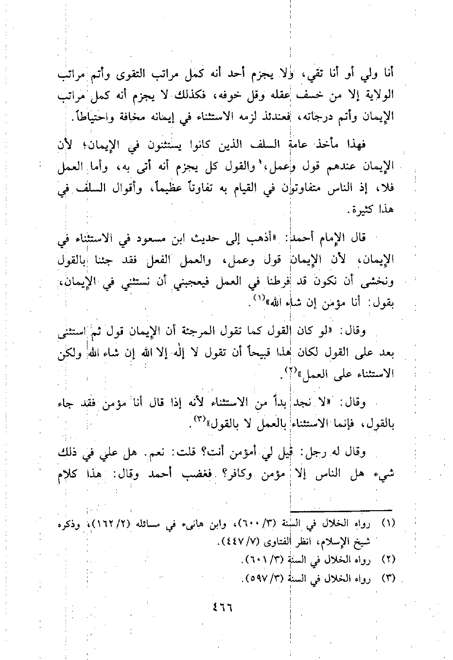 قال الإمام أحمد: "أذهب إلى حديث ابن مسعود في الاستثناء في الإيمان، لأن الإيمان قول وعمل، والعمل الفعل فقد جئنا بالقول ونخشى أن نكون قد فرطنا في العمل فيعجبني أن نستثني في الإيمان، بقول: أنا مؤمن إن شاء الله"1.