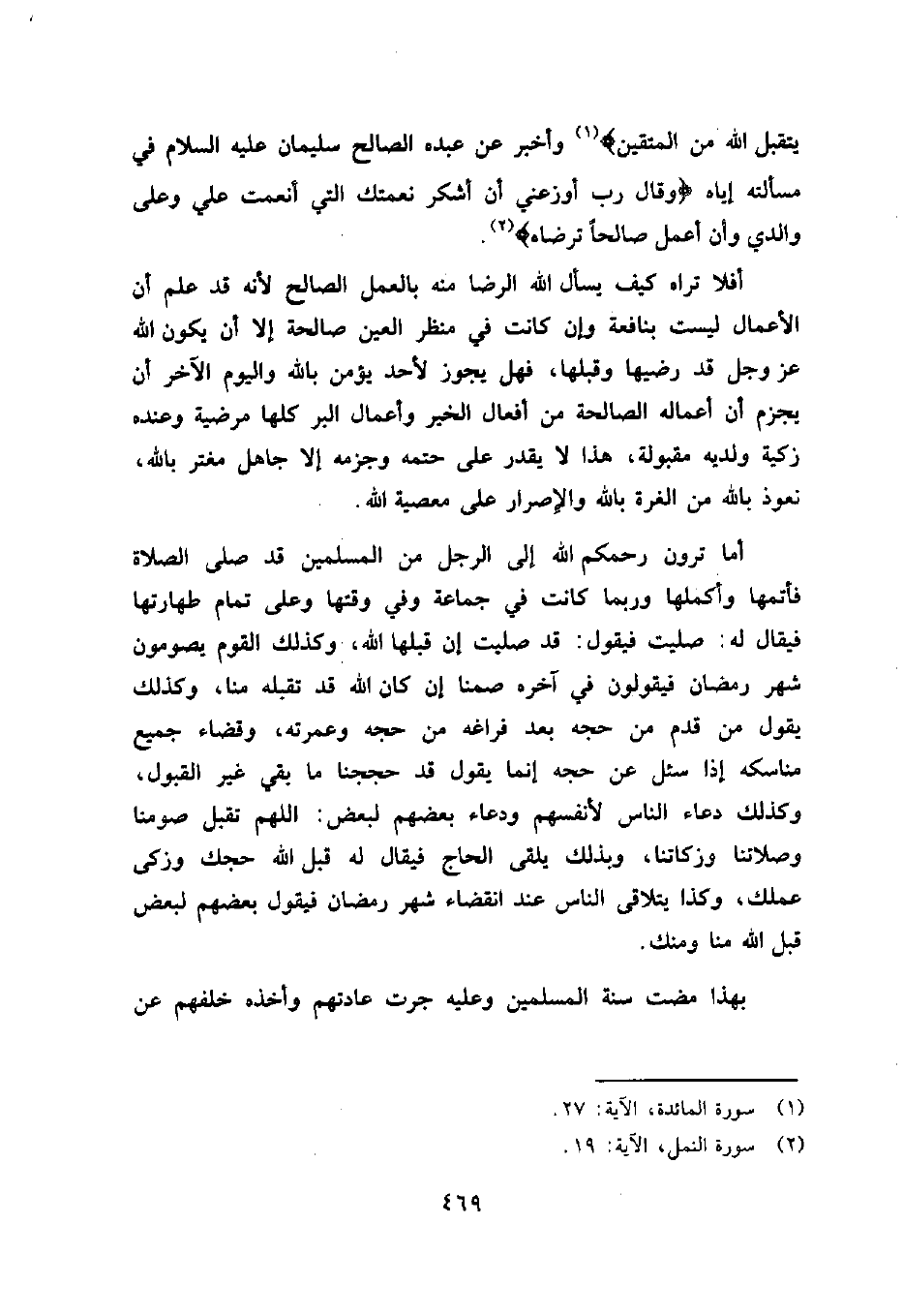 يَتَقَبَّلُ اللَّهُ مِنَ الْمُتَّقِينَ} 1 وأخبر عن عبده الصالح سليمان عليه السلام في مسألته إياه {وَقَالَ رَبِّ أَوْزِعْنِي أَنْ أَشْكُرَ نِعْمَتَكَ الَّتِي أَنْعَمْتَ عَلَيَّ وَعَلَى وَالِدَيَّ وَأَنْ أَعْمَلَ صَالِحاً تَرْضَاهُ} 2.