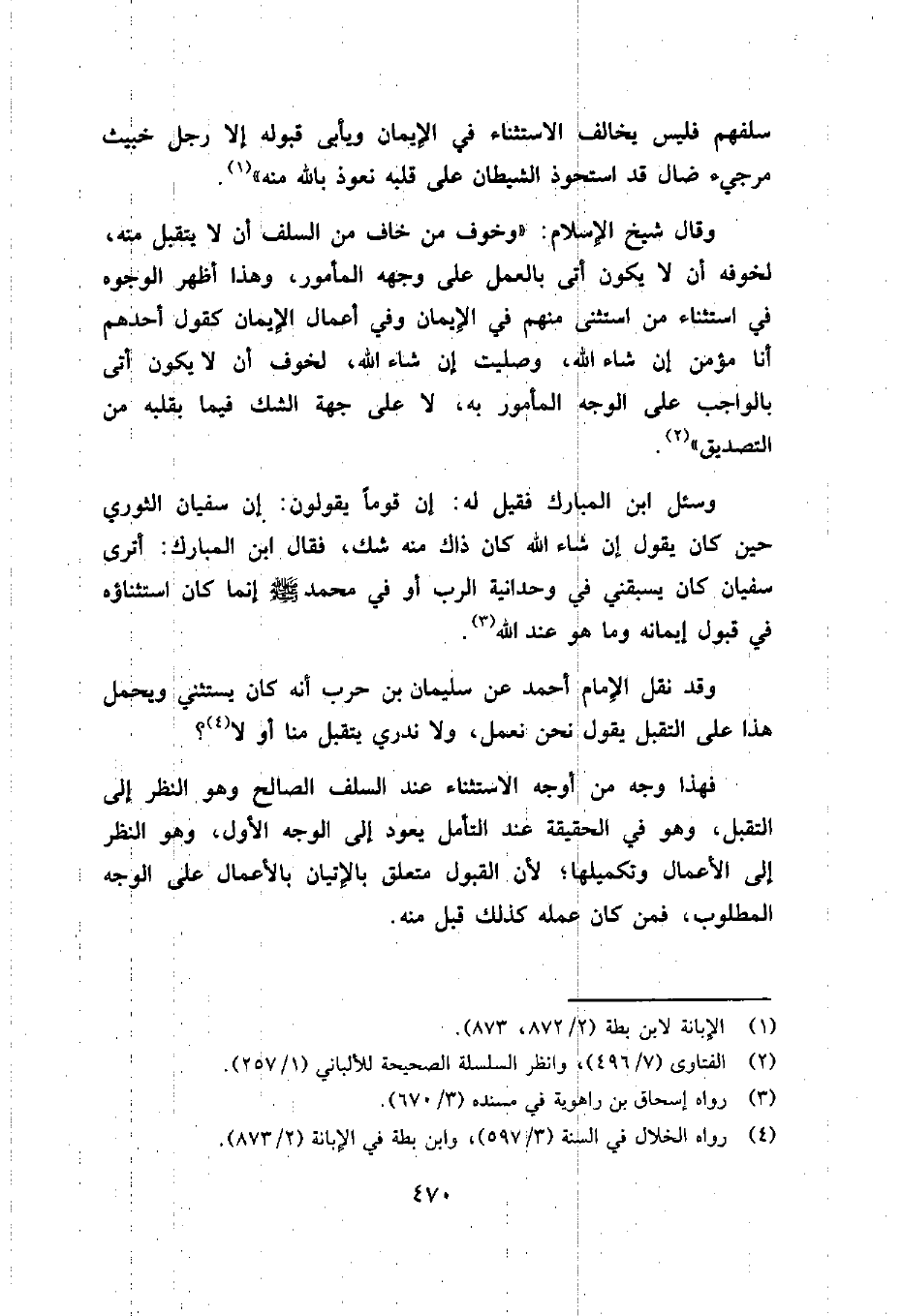 وقال شيخ الإسلام: "وخوف من خاف من السلف أن لا يتقبل منه، لخوفه أن لا يكون أتى بالعمل على وجهه المأمور، وهذا أظهر الوجوه في استثناء من استثنى منهم في الإيمان وفي أعمال الإيمان كقول أحدهم أنا مؤمن إن شاء الله، وصليت إن شاء الله، لخوف أن لا يكون أتى بالواجب على الوجه المأمور به، لا على جهة الشك فيما بقلبه من التصديق"2.
