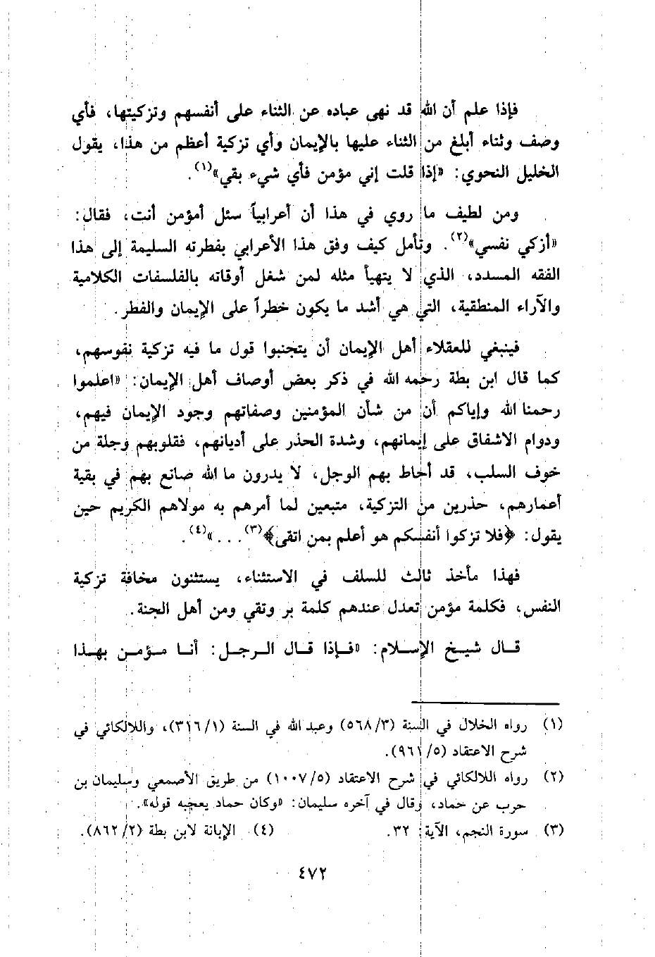 فإذا علم أن الله قد نهى عباده عن الثناء على أنفسهم وتزكيتها، فأي وصف وثناء أبلغ من الثناء عليها بالإيمان وأي تزكية أعظم من هذا، يقول الخليل النحوي: "إذا قلت إني مؤمن فأي شيء بقي"1.