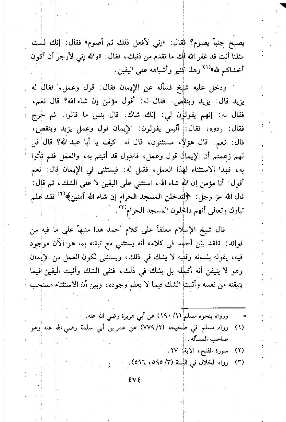 ودخل عليه شيخ فسأله عن الإيمان فقال: قول وعمل، فقال له يزيد قال: يزيد وينقص. فقال له: أقول مؤمن إن شاء الله؟ قال نعم، فقال له: إنهم يقولون لي: إنك شاك. قال بئس ما قالوا. ثم خرج فقال: ردوه، فقال: أليس يقولون: الإيمان قول وعمل يزيد وينقص، قال: نعم. قال هؤلاء مستثنون، قال له: كيف يا أبا عبد الله؟ قال قل لهم زعمتم أن الإيمان قول وعمل، فالقول قد أتيتم به، والعمل فلم تأتوا به، فهذا الاستثناء لهذا العمل، فقيل له: فيستثنى في الإيمان قال: نعم أقول: أنا مؤمن إن الله شاء الله، استثني على اليقين لا على الشك، ثم قال: قال الله عز وجل: {لَتَدْخُلُنَّ الْمَسْجِدَ الْحَرَامَ إِنْ شَاءَ اللَّهُ آمِنِينَ} 2 فقد علم تبارك وتعالى أنهم داخلون المسجد الحرام3.