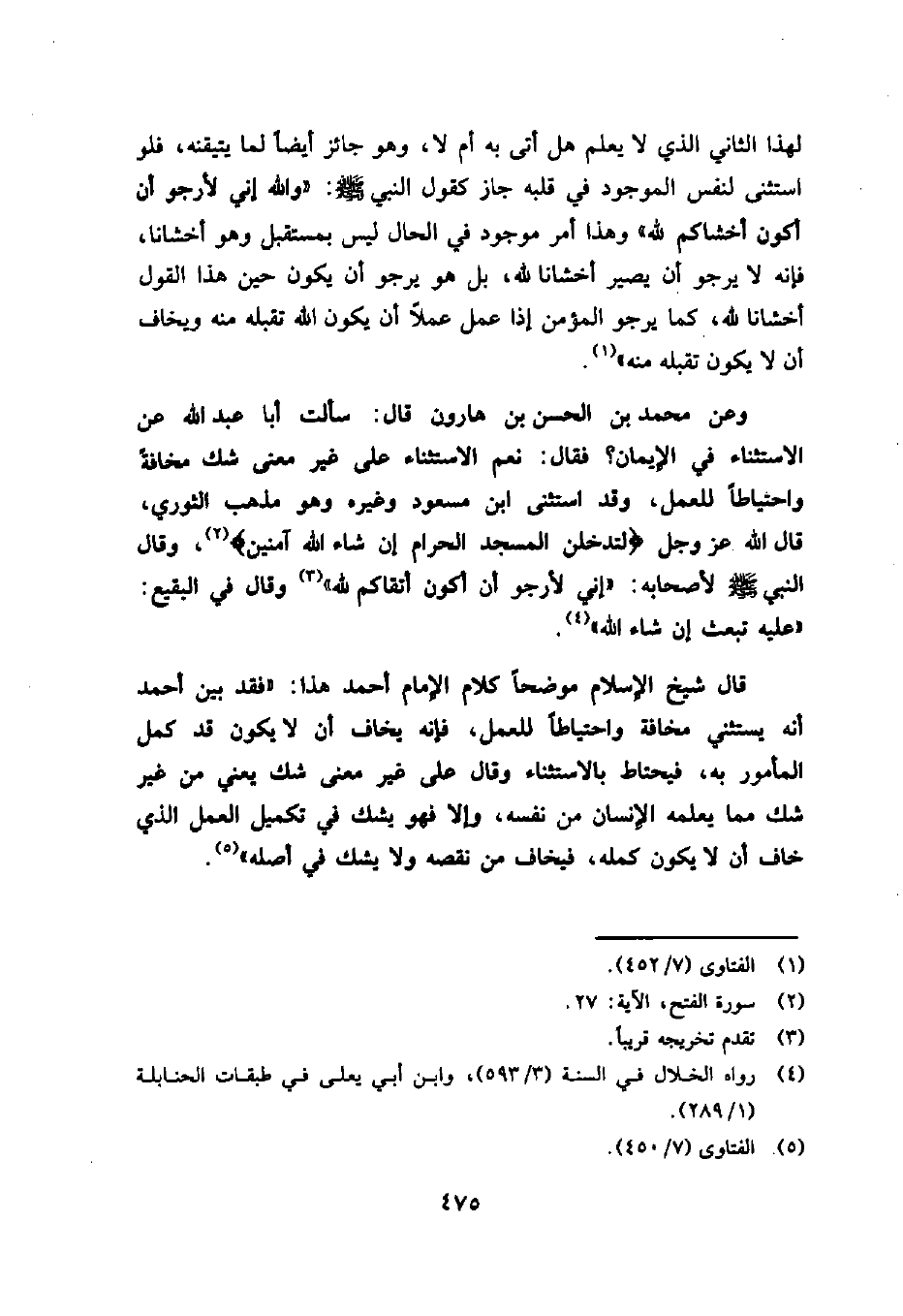 وعن محمد بن الحسن بن هارون قال: سألت أبا عبد الله عن الاستثناء في الإيمان؟ فقال: نعم الاستثناء على غير معنى شك مخافةً واحتياطاً للعمل، وقد استثنى ابن مسعود وغيره وهو مذهب الثوري، قال الله عز وجل {لَتَدْخُلُنَّ الْمَسْجِدَ الْحَرَامَ إِنْ شَاءَ اللَّهُ آمِنِينَ} 2، وقال النبي صلى الله عليه وسلم لأصحابه: "إني لأرجو أن كون أتقاكم لله" 3 وقال في البقيع: "عليه تبعث إن شاء الله" 4.