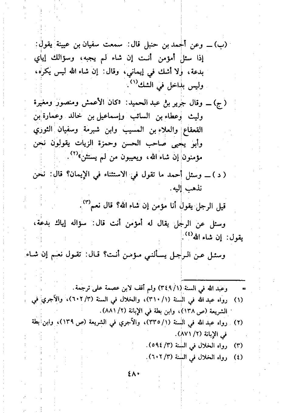 (د) وسئل أحمد ما تقول في الاستثناء في الإيمان؟ قال: نحن نذهب إليه.