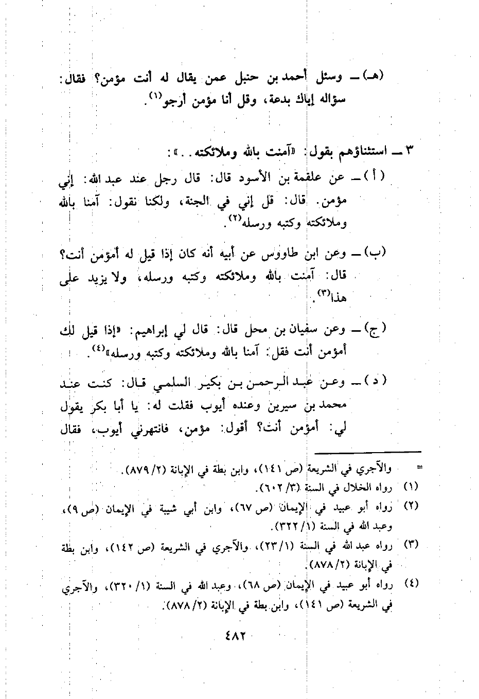 (هـ) - وسئل أحمد بن حنبل عمن يقال له أنت مؤمن؟ فقال: سؤاله إياك بدعة، وقل أنا مؤمن أرجو1.