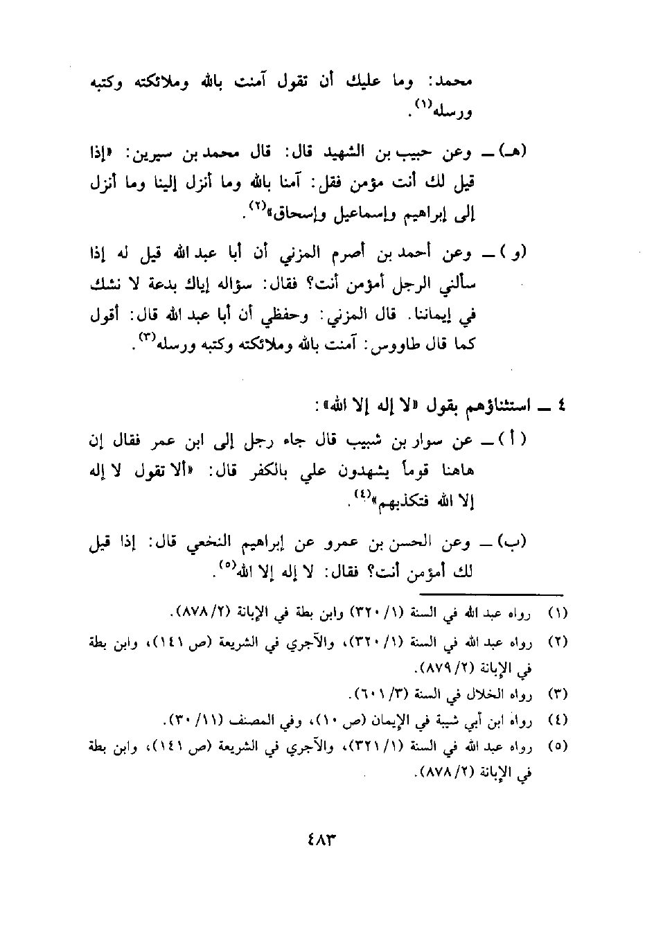 (ب) وعن الحسن بن عمرو عن إبراهيم النخعي قال: إذا قيل لك أمؤمن أنت؟ فقال: لا إله إلا الله5.