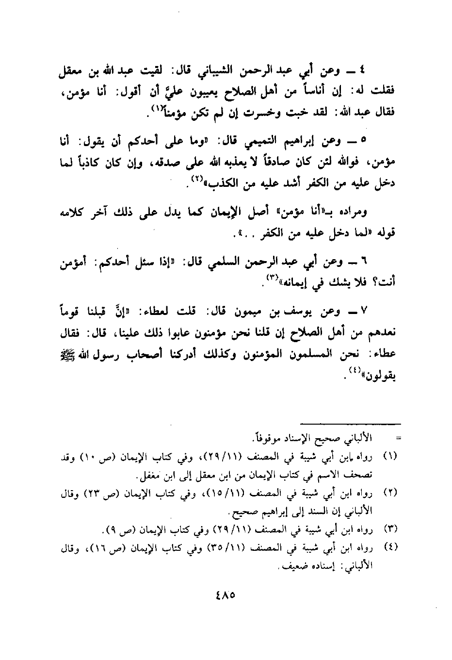 4 رواه ابن أبي شيبة في المصنف (11/35) وفي كتاب الإيمان (ص 16) ، وقال الألباني: إسناده ضعيف.
