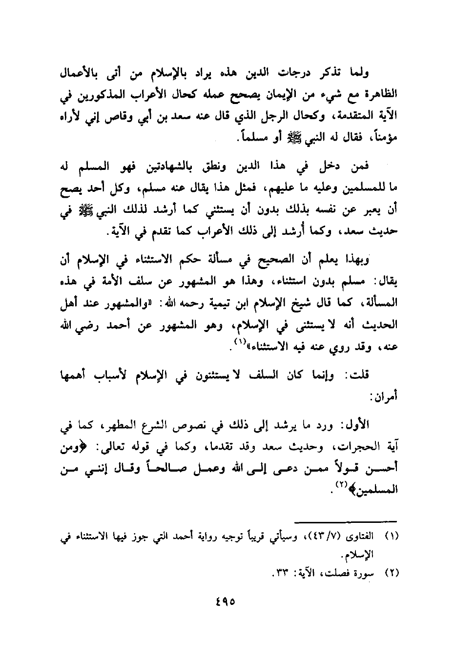 قلت: وإنما كان السلف لا يستثنون في الإسلام لأسباب أهمها أمران: