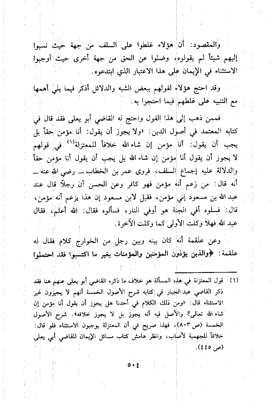 1 قول المعتزلة في هذه المسألة هو خلاف ما ذكره القاضي أبو يعلى عنهم هنا فقد ذكر القاضي عبد الجبار في كتابه شرح الأصول الخمسة أنهم لا يجيزون غير الاستثناء قال: "ومن ذلك الكلام في أحدنا هل يجوز أن يقول أنا مؤمن إن شاء الله تعالى؟ والأصل فيه أنه يجوز بل لا يجوز خلافه". شرح الأصول الخمسة (ص 803) ، فهذا صريح في أن المعتزلة يوجبون الاستثناء فلو قال: خلافاً للجهمية لأصاب، وانظر هامش كتاب مسائل الإيمان للقاضي أبي يعلى (ص 445) .