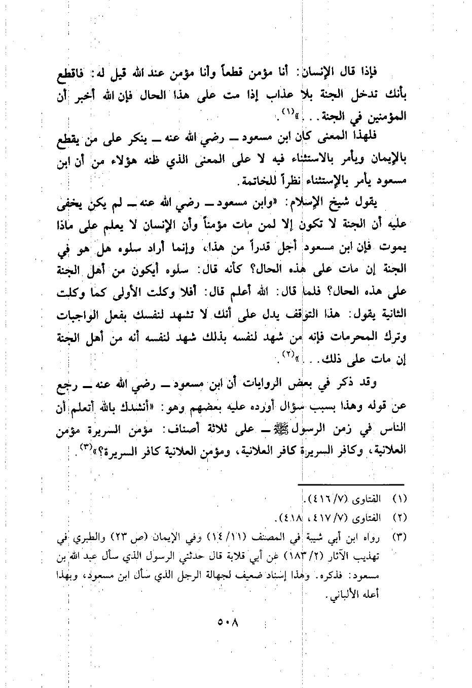 فلهذا المعنى كان ابن مسعود- رضي الله عنه- ينكر على من يقطع بالإيمان ويأمر بالاستثناء فيه لا على المعنى الذي ظنه هؤلاء من أن ابن مسعود يأمر بالاستثناء نظراً للخاتمة.