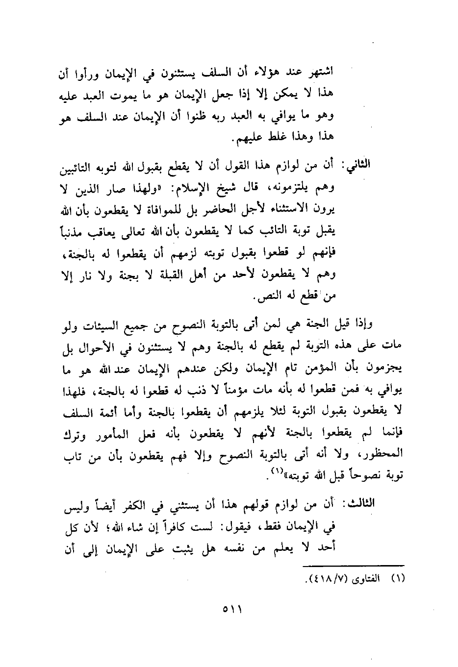 اشتهر عند هؤلاء أن السلف يستثنون في الإيمان ورأوا أن هذا لا يمكن إلا إذا جعل الإيمان هو ما يموت العبد عليه