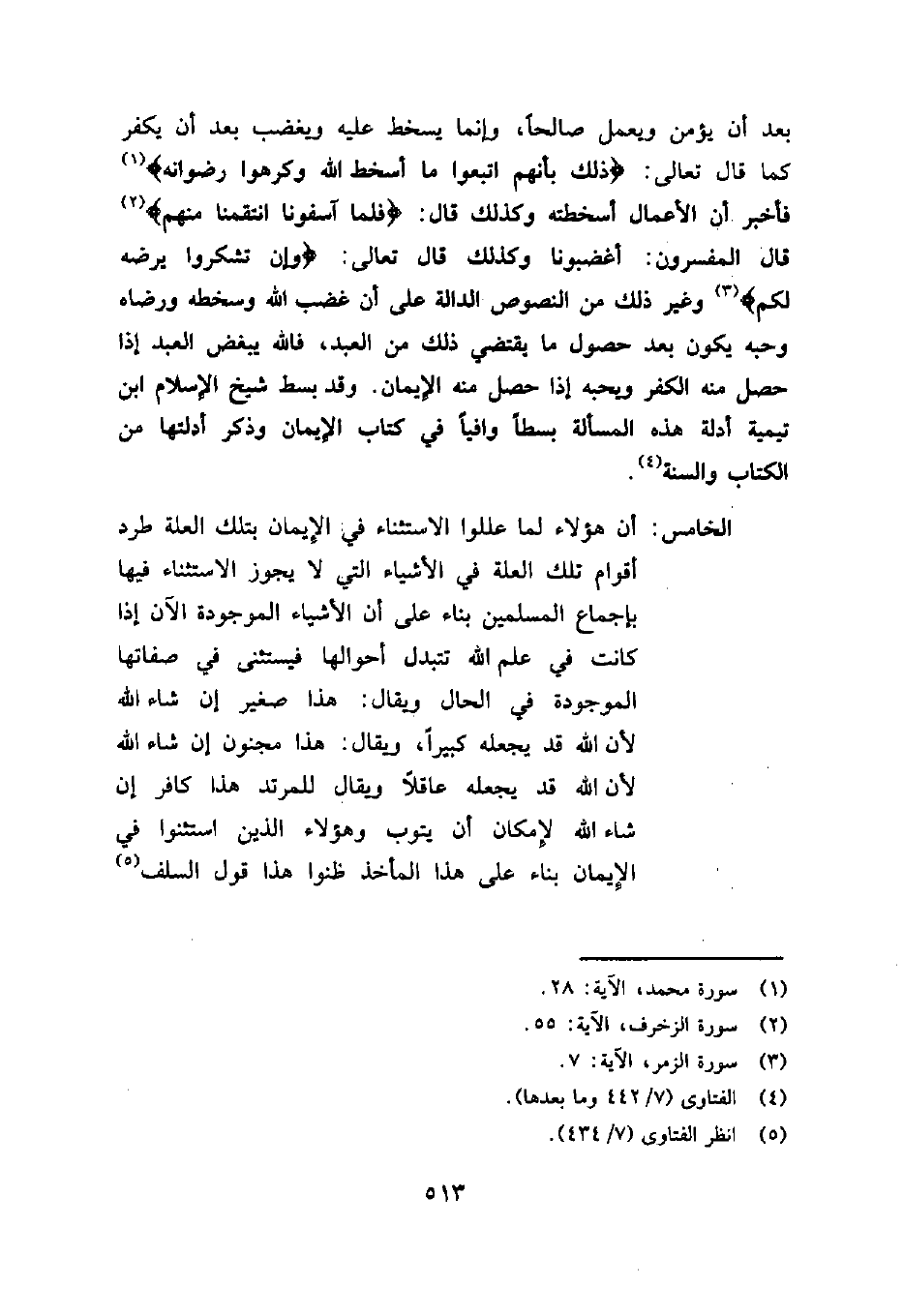بإجماع المسلمين بناء على أن الأشياء الموجودة الآن إذا كانت في علم الله تتبدل أحوالها فيستثنى في صفاتها الموجودة في الحال ويقال: هذا صغير إن شاء الله لأن الله قد يجعله كبيراً، ويقال: هذا مجنون إن شاء الله لأن الله قد يجعله عاقلاً ويقال للمرتد هذا كافر إن شاء الله لإمكان أن يتوب وهؤلاء الذين استثنوا في الإيمان بناء على هذا المأخذ ظنوا هذا قول السلف5.
