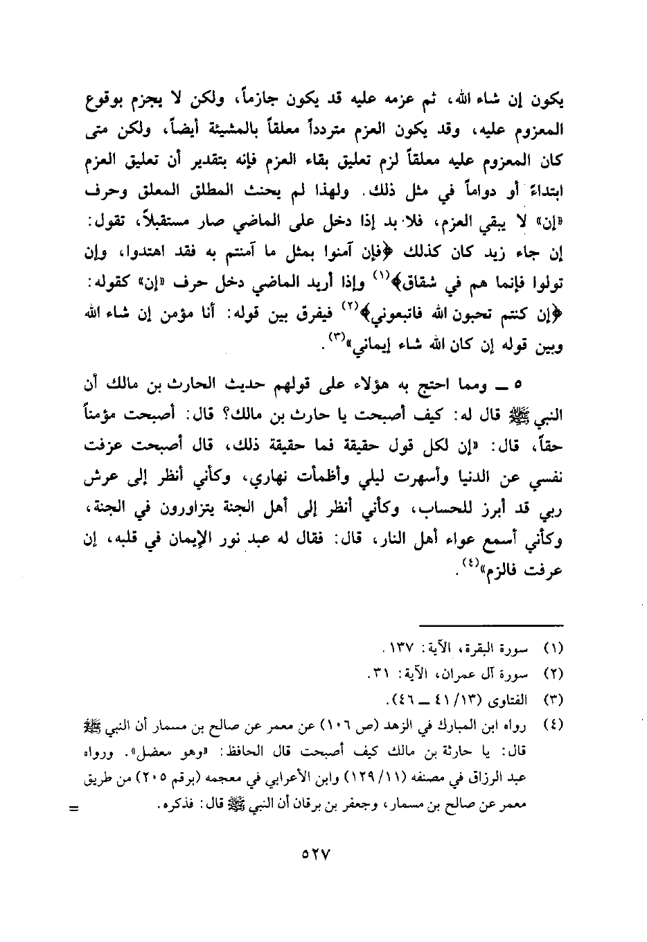 5- ومما احتج به هؤلاء على قولهم حديث الحارث بن مالك أن النبي صلى الله عليه وسلم قال له: كيف أصبحت يا حارث بن مالك؟ قال: أصبحت مؤمناً حقاً، قال: "إن لكل قول حقيقة فما حقيقة ذلك، قال أصبحت عزفت نفسي عن الدنيا وأسهرت ليلي وأظمأت نهاري، وكأني أنظر إلى عرش ربي قد أبرز للحساب، وكأني أنظر إلى أهل الجنة يتزاورون في الجنة، وكأني أسمع عواء أهل النار، قال: فقال له عبد نور الإيمان قي قلبه، إن عرفت فالزم" 4.