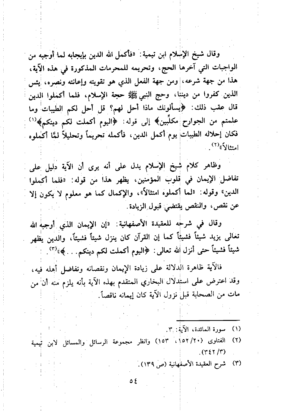وقال في شرحه للعقيدة الأصفهانية:"إن الإيمان الذي أوجبه الله تعالى يزيد شيئاً فشيئاً كما إن القرآن كان ينزل شيئاً فشيئاً، والدين يظهر شيئاً فشيئاً حتى أنزل الله تعالى: {الْيَوْمَ أَكْمَلْتُ لَكُمْ دِينَكُمْ ... } 3.